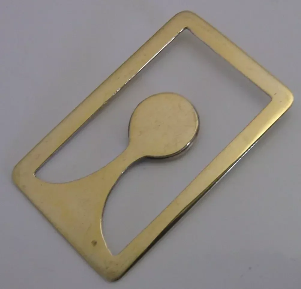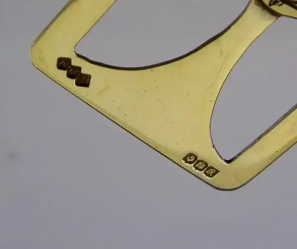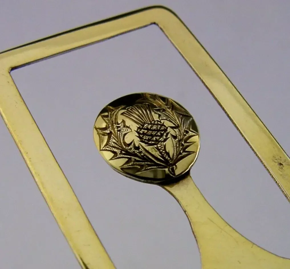 A rare Scottish solid sterling silver gilt bookmark or page maker. It is hallmarked for Edinburgh 1947 with the makers mark being that of Robert James Napier. It has been beautifully designed having an unusual design and has been engraved with a thistle and gilded. It is in superb condition being free from digs splits and repairs. It measures approx. 2 inches (4.7cms) long by 1.25 inches and weighs 7 grams. A beautifully designed rare example.