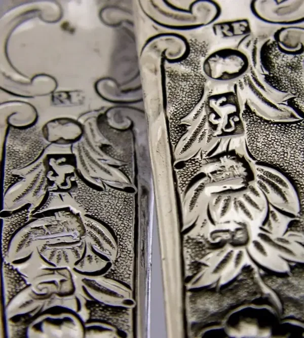 A stunning rare pair of English provincial Georgian antique solid sterling silver berry serving spoons. They are hallmarked for Exeter 1792 with the maker being William Ferris. They have been superbly made being embossed with fruit and interestingly engraved with a stags head and wreath crest used by both the Belligham and Lloyd Families (the wreath looks like a feather but I'm pretty sure its supposed to be a wreath as I can find no crest with a stags head and feather). They are in superb condition being free from dings splits distortions and repairs. They measure approx. 9 inches (23cm) long by 2 inches (4.8cm) wide and weighs 115 grams. A super quality early pair.