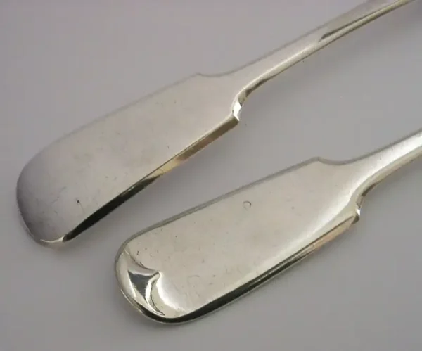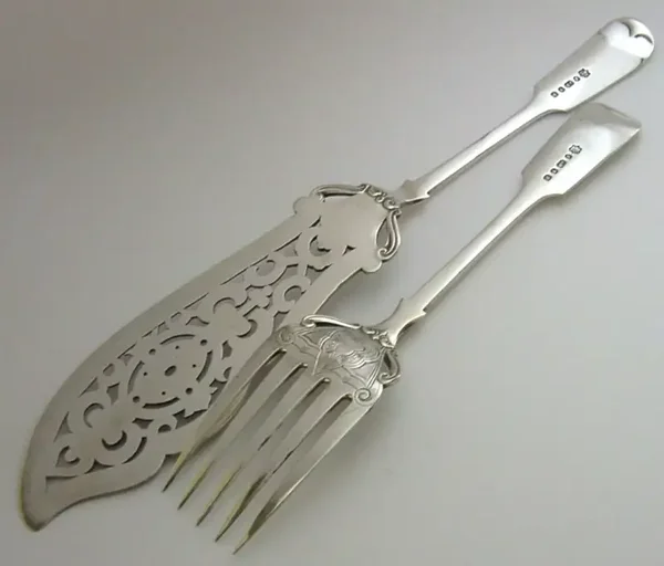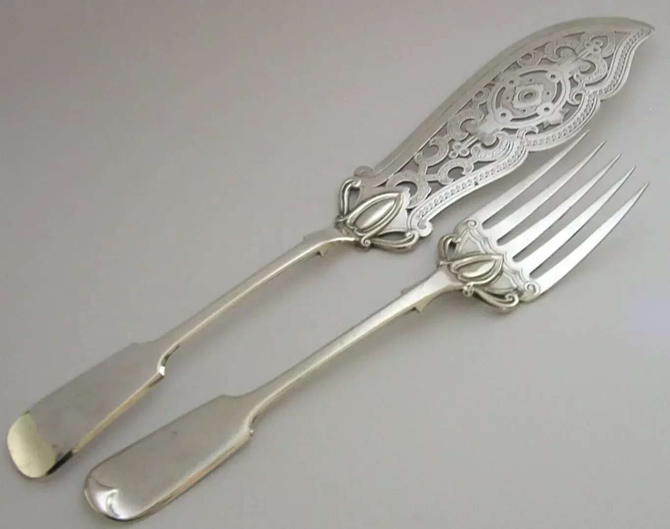 A superb set of English Victorian antique silver plated fish servers. They are marked with the makers mark of Elkington & Co with the date letter F for 1868. They have been beautifully designed and are in superb condition being free from dings splits and repairs. The fork measures 10 inches (25.6cm) long by almost 2 inches (5cm) wide and the slice 13.5 inches (34.2cm) long by 2.25 inches (5.8cm) wide and have a combined weight of 292 grams. A very nice quality set.