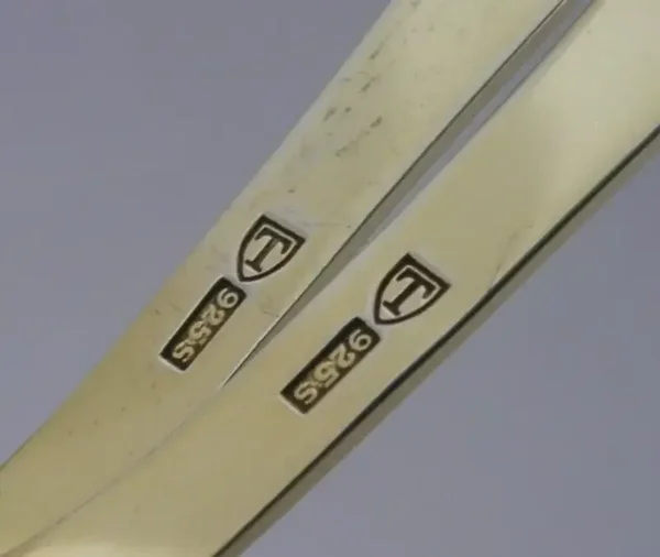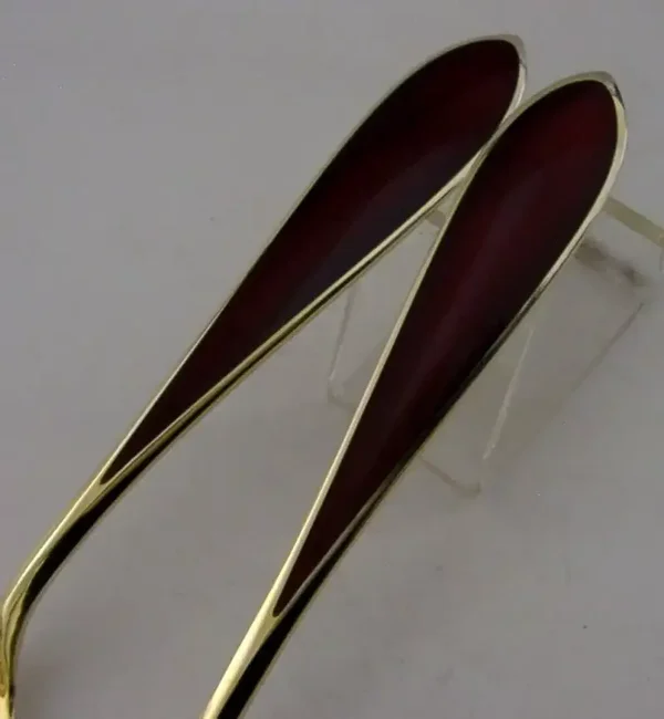 A beautiful set of Norwegian solid sterling silver gilt and red enamelled salad servers. They are hallmarked with the Norwegian 925S standard mark along with the makers mark of Thune. I would date them to c1950-1960. They have been superbly designed and are in superb condition being free from dings splits and repairs. The enamel is perfect. They measures approx. 7 inches (17.8cm) long by 1.75 inches (4.6cm) wide and they have a combined weight of 94 grams. Very well made examples.