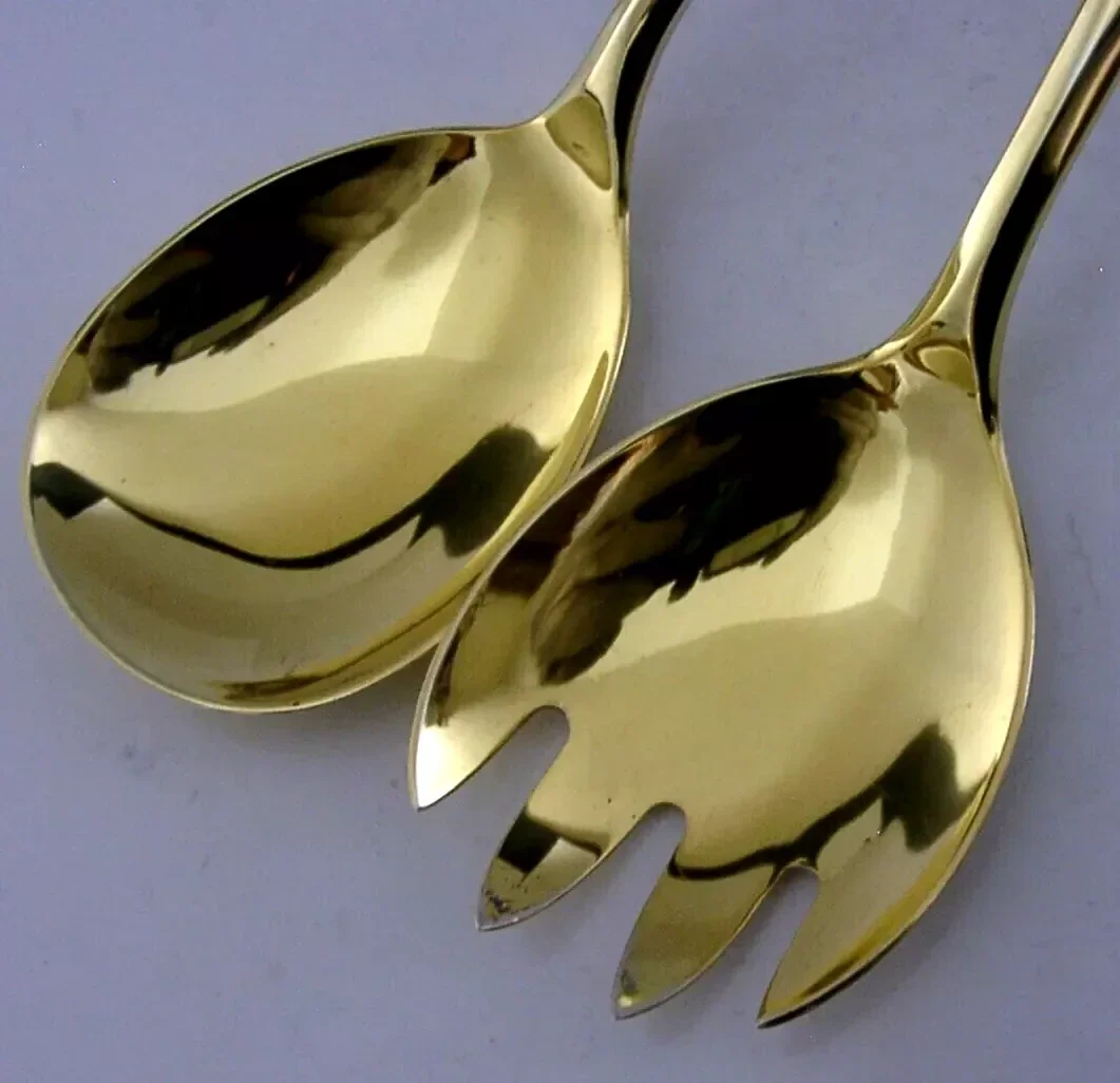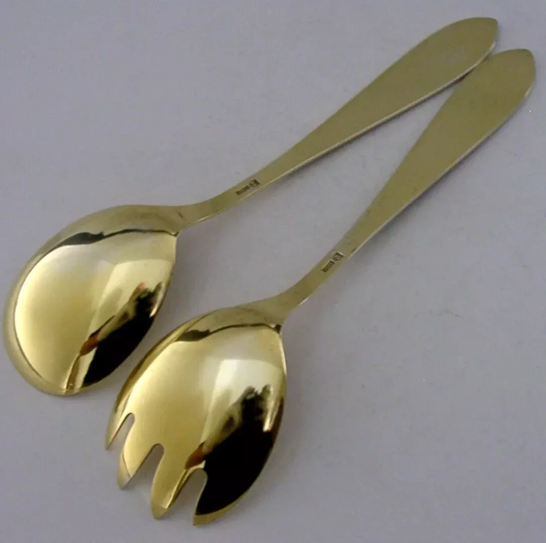STUNNING NORWEGIAN SOLID STERLING SILVER GILT ENAMEL SALAD SERVERS c1950 THUNE