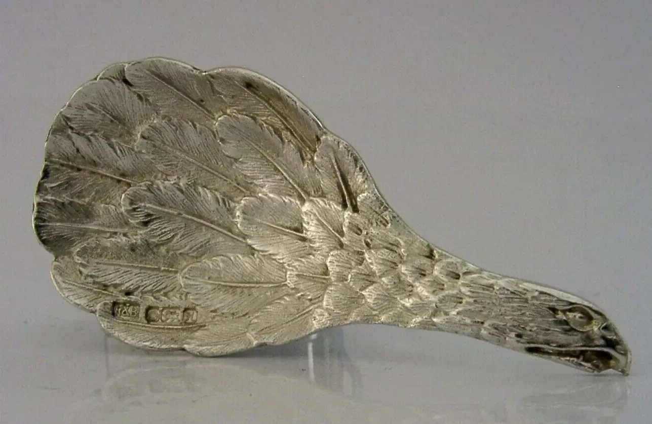 A super quality unusual English solid sterling silver caddy spoon. It is hallmarked for Sheffield 1982 with the maker's mark being that of Roberts and Belk. It has been superbly made being in the form of an eagle, a copy of an earlier Georgian design. It is in super condition being free from dings splits distortions and repairs. It measures approx. 3 inches (7.7cm) long by 1.25 inches (3.5cm) wide and weighs 21 grams. A very nice clean rare example.