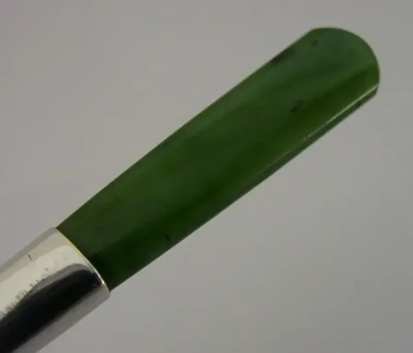 A rare antique sterling silver New Zealand green jade caddy spoon or sugar scoop. It is hallmarked STERLING SILVER along with a makers mark, and I would date it to c1920s. It has been superbly made and is in super condition being free from dings splits chips cracks and repairs. It measure approx. 5 inches (13cm) long by 1.25 inches (2.8cm) wide and weighs 22 grams. A super quality rare example.