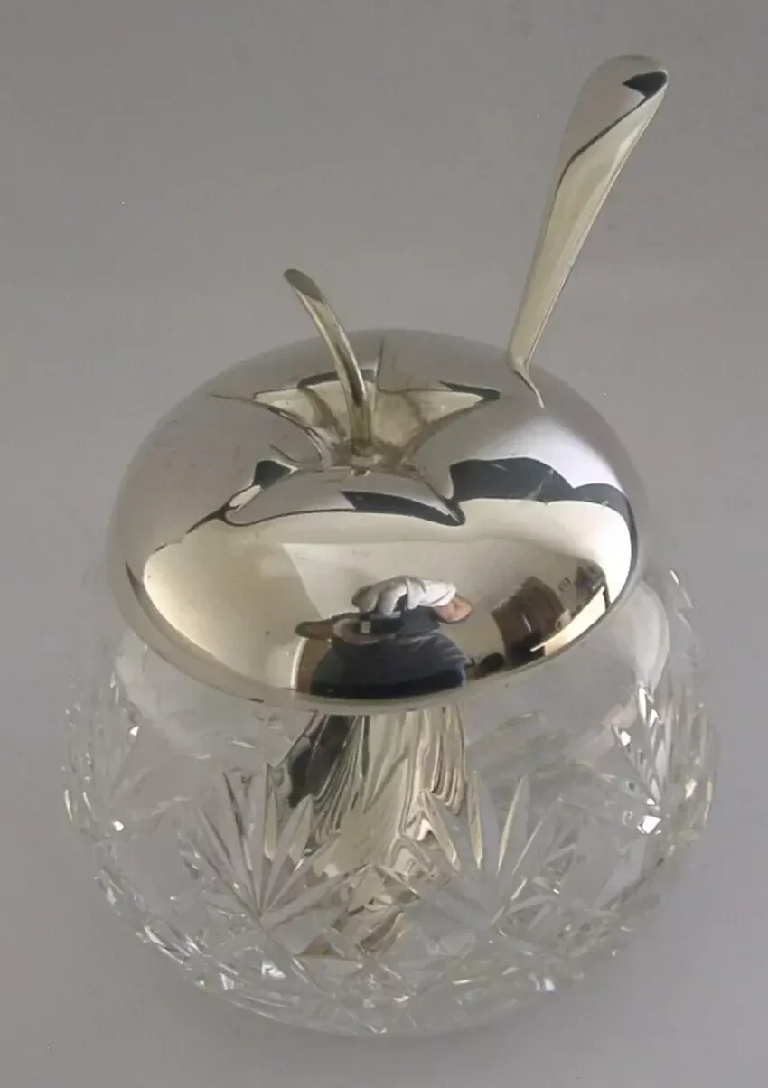 A stunning novelty English solid sterling silver and cut glass pot and spoon. It is hallmarked for Birmingham 1996 with the makers mark being that of Barker Ellis Silver Co. It has been beautifully made being in the form of a apple, or maybe a cranberry, designed to hold sauce. It is in super condition. The silver is free from dings splits repairs and dings. The glass is free from cracks chips and repairs. It is a good size measuring approx. 4 inches (10cm) tall by 3.75 inches (9.5cm) wide and weighs 394 grams. A beautifully made unusual piece.