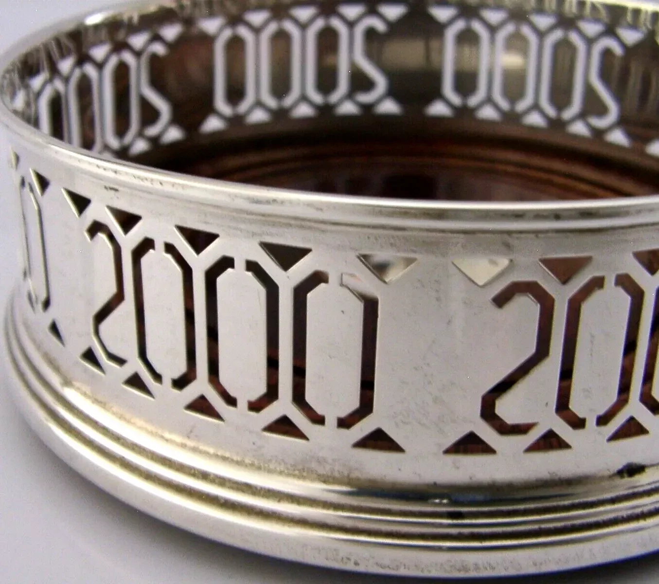 A super quality English solid sterling silver wine or campaign bottle coaster. It is hallmarked for Birmingham 2000 with the makers marks being that of W I Broadway & Co. It has been superbly made with the sides being pierced in the form of the year 2000. It is in super condition being free from dings splits and repairs, very slight distortion of the pierced work see final photo. It measures approx. 5 inches (13cm) across by 2 inches (5cm) tall and weighs 170 grams. A very nice quality piece.