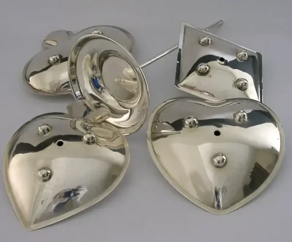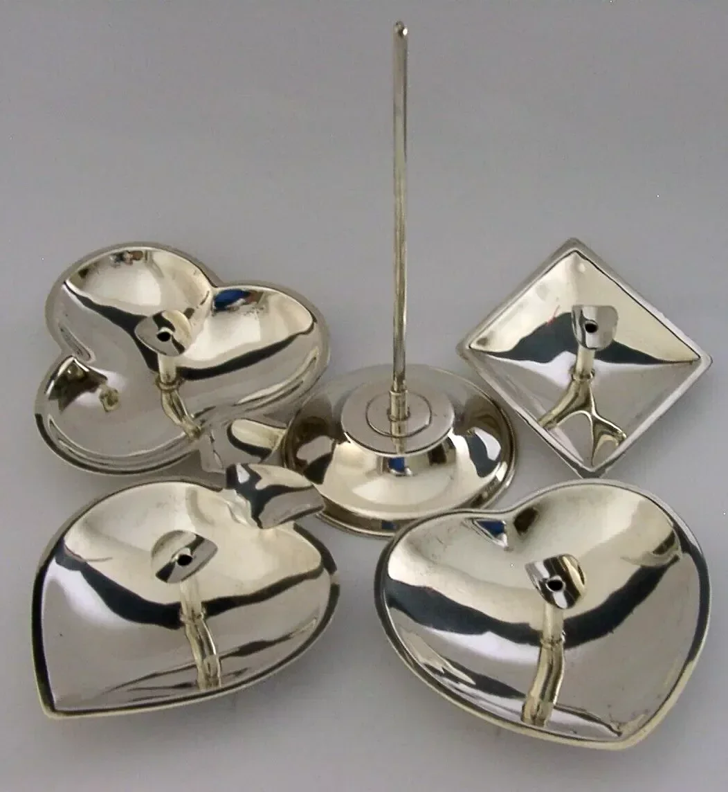 A rare good sized set of stacked sterling silver dishes. They are hallmarked with Mexican marks including the 925 sterling silver standard mark and test as such. I would date them to c1980. They have been beautifully made in the form of playing card suits and are in superb condition being free from dings splits and repairs. The set measures 6.75 inches (16.7cms) tall by 4.5 inches (11.3cms) at its wides and altogether weighs 215 grams. A beautiful stylish piece.