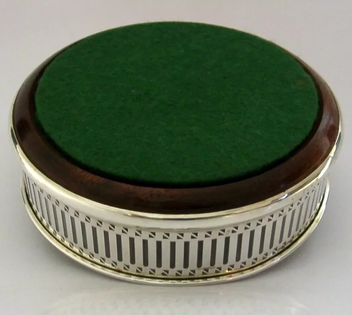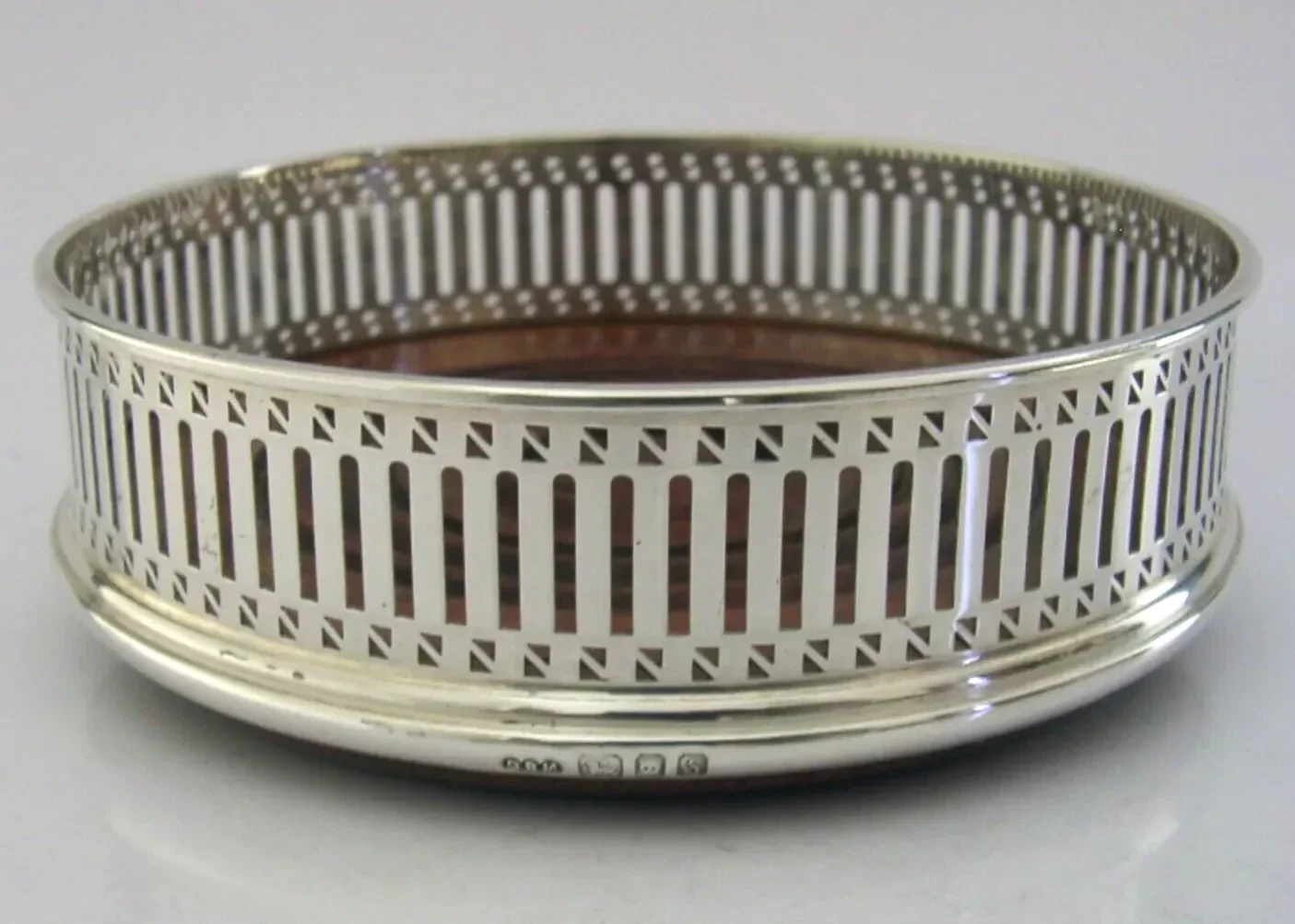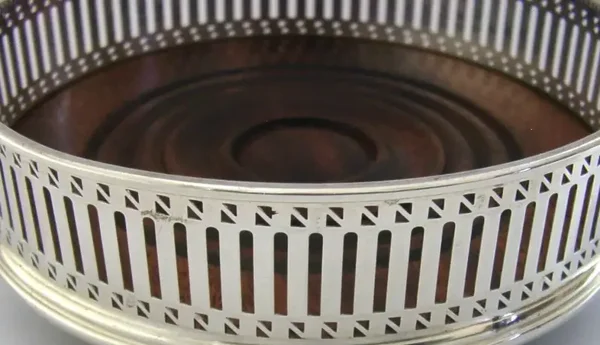 A super quality mint English solid sterling silver wine or campaign bottle coaster. It is hallmarked for London 1992 with the maker being David R Mills. It has been superbly made with the sides being pierced. It is in superb condition being free from dings splits and repairs. It measures approx. 5 inches (12.8cm) across by over 1.5 inches (4cm) tall and weighs 128 grams. A very nice quality clean piece.