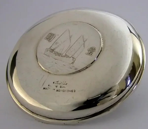 A rare Chinese export solid sterling silver coin dish. It is marked STERLING SILVER MADE IN HONG KONG along with the makers mark of Wai Kee. It has been superbly designed having a Chinese 1934 Junk coin to its centre. It in super condition being free from dings splits and repairs. It measures approx. 3.5 inches (8.6cm) across and weighs 60 grams. A superbly made rare piece.