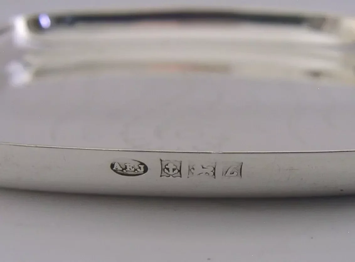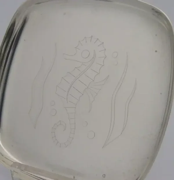 A beautiful English solid sterling silver dish. It is hallmarked for Birmingham 1960 with makers marks being that of AE Jones along with the designers mark of Geoffrey Bellamy. It has been superbly designed being engraved with a seahorse. It is in super condition being free from dings splits distortions and repairs. It measures approx. 3.25 inches (8.2cm) square and weighs 56 grams. A very pretty piece.