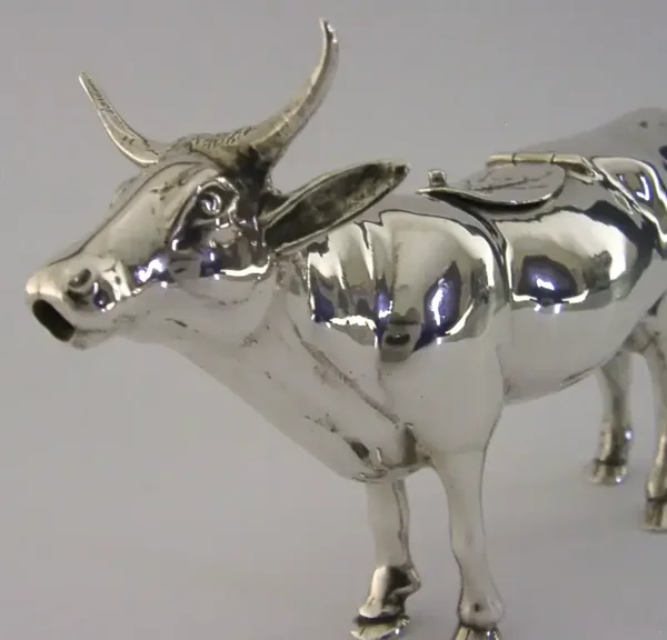 A beautiful rare very high quality solid sterling silver novelty cow creamer / cream jug. It is hallmarked with English import marks for London 1959 with the importers mark being that of Israel Freeman & Son Ltd. It has been superbly made and unusually the lid has been engraved with a bug or fly. It is in outstanding condition being free from dings splits and repairs. It measures approx. 5.5 inches (15cm) long by 1.5 inches (3.6cm) wide by 3.5 inches (8.7cm) tall and weighs 126 grams. A beautiful high quality piece.