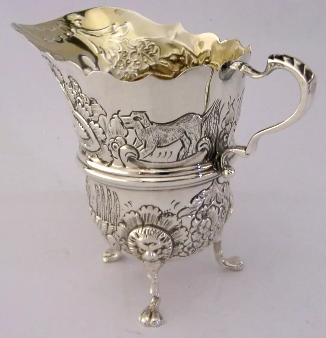 A beautiful top quality English solid sterling silver cream jug. It is hallmarked for Birmingham 1976 with the maker being TH. It has been superbly made incorporating various animals and is in superb condition being free from dings splits and repairs, the inside has been gilded. It measures approx. 3.5 inches tall by 4.5 inches (11.5cms) wide including the handle and weighs 106 grams. A beautiful high quality piece.