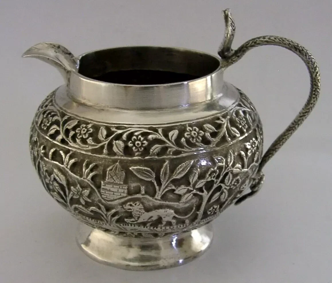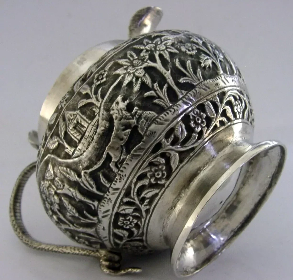 A beautiful rare antique solid silver Indian jug. It is unmarked but tests as high grade silver. I would date it to c1890-1910. It has been beautifully hand made being embossed and chased with animals and the the handle has being cast in the form of a snake. It is in superb condition being free from dings splits holes and repairs. It measures approx. 4.5 inches (11.4cm) across handle to lip and 2.25 inches (5.6cm) across the rim by 3.75 inches (9.5cm) tall to the top of the snakes head and weighs 164 grams. A superbly designed beautiful example.