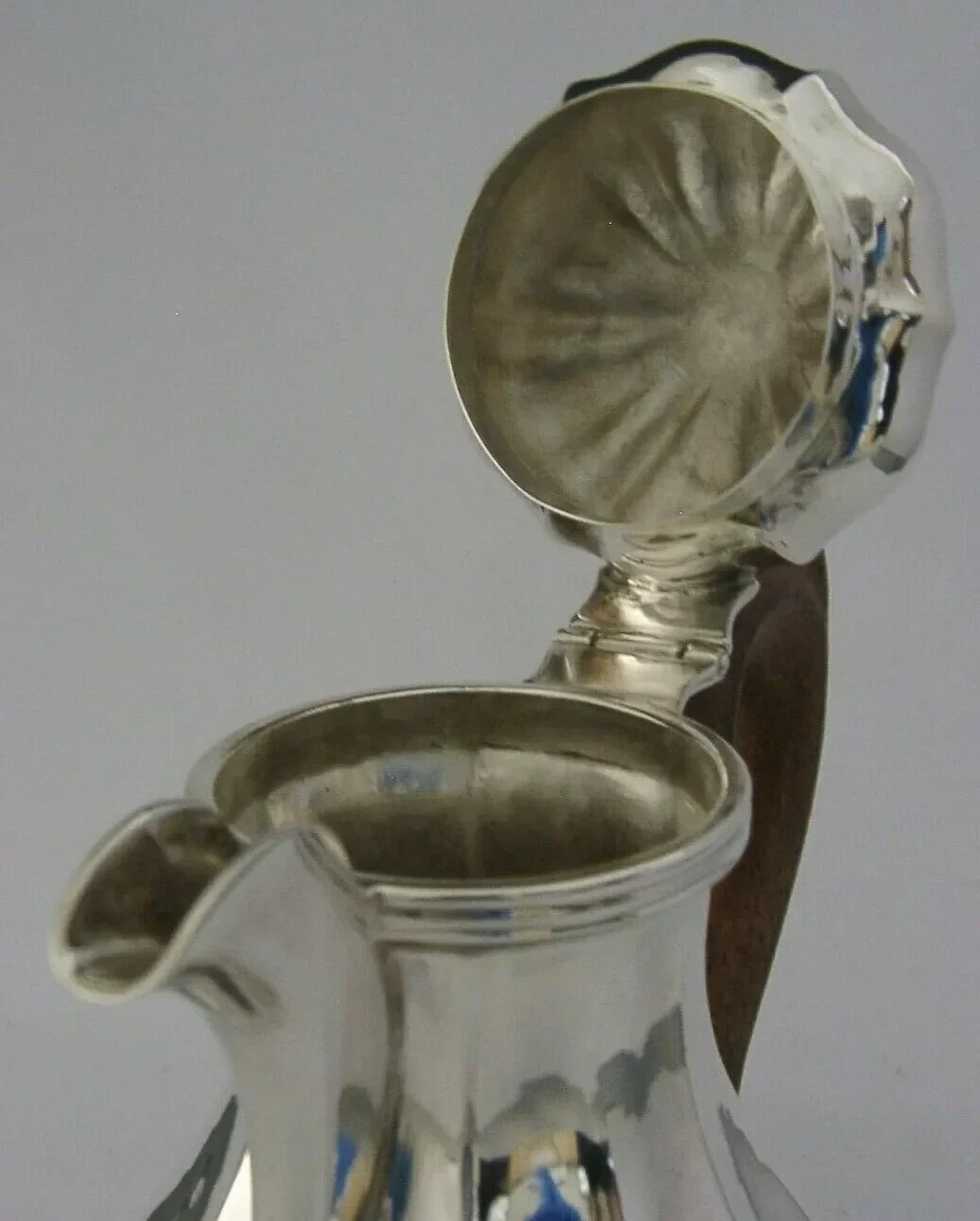A stunning Italian hand made solid silver lidded jug. It is hallmarked with Italian silver marks that date from 1968 with the makers mark being Passoni, I would date it to c1970s-1980's. It has been beautifully designed having a wooden handle and a hand beaten finish. It is is outstanding condition. The silver is free from splits repairs and dings. It measures approx. 5 inches (12.6cms) tall to the top of the finial by 5 inches (12.6cms) spout to handle by 2.75 inches (7cms) wide and weighs 212 grams. A beautiful usable high quality piece.