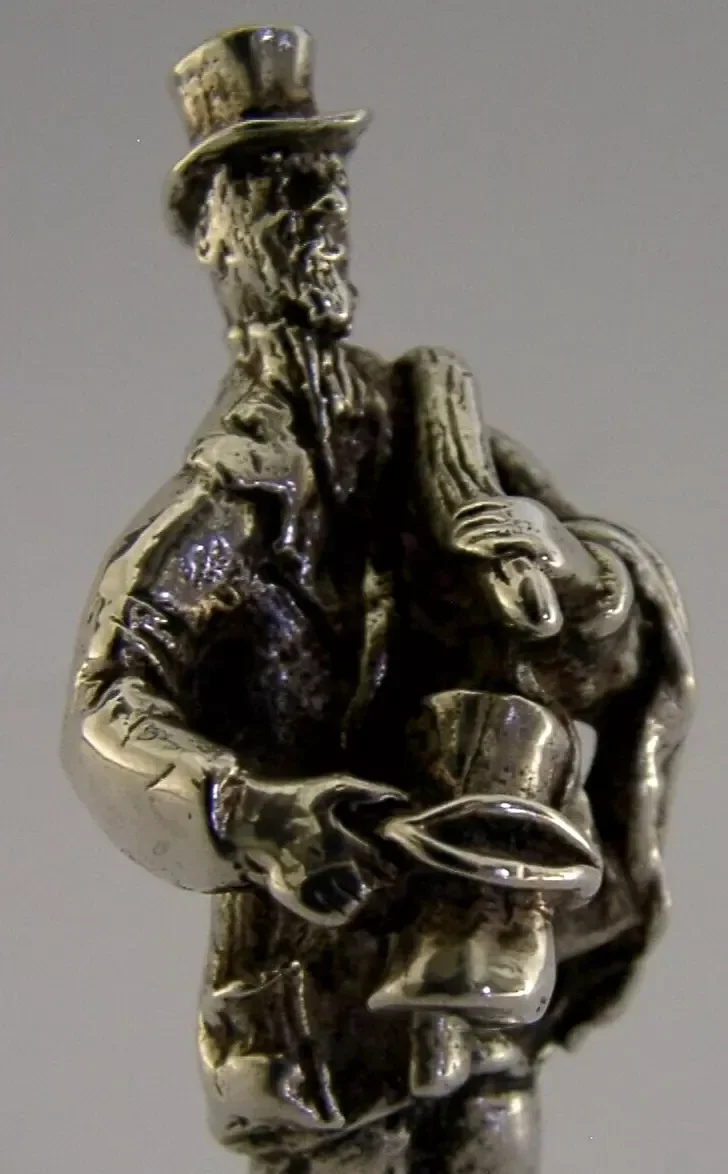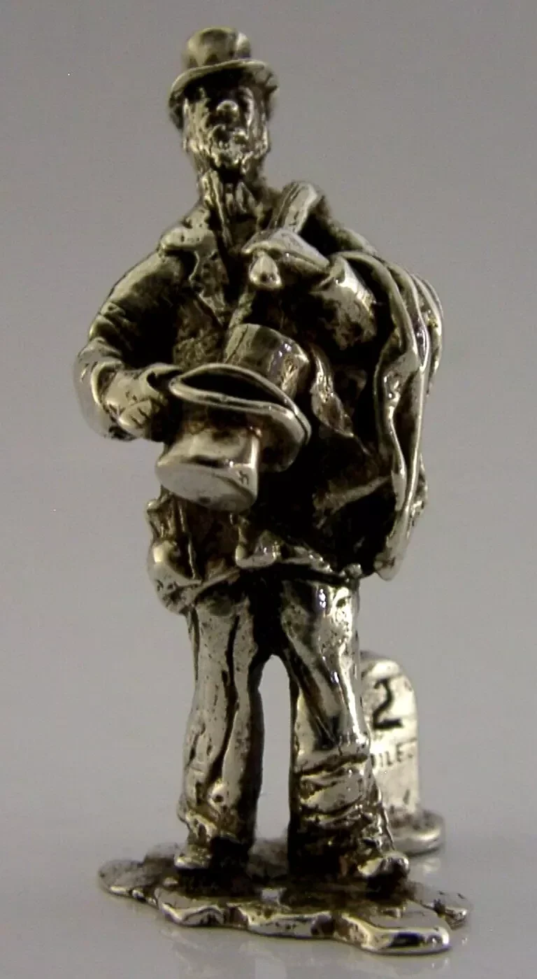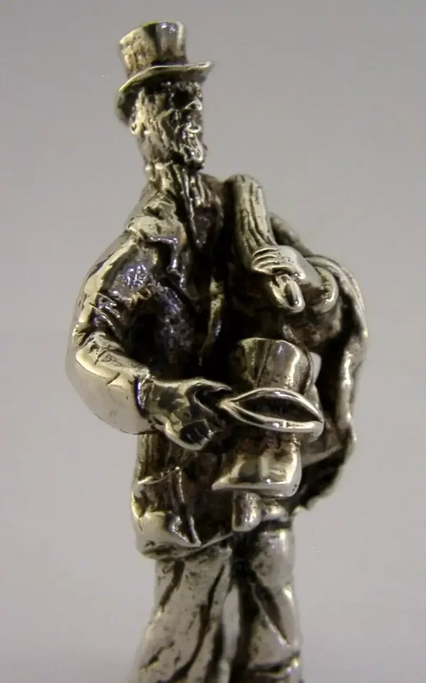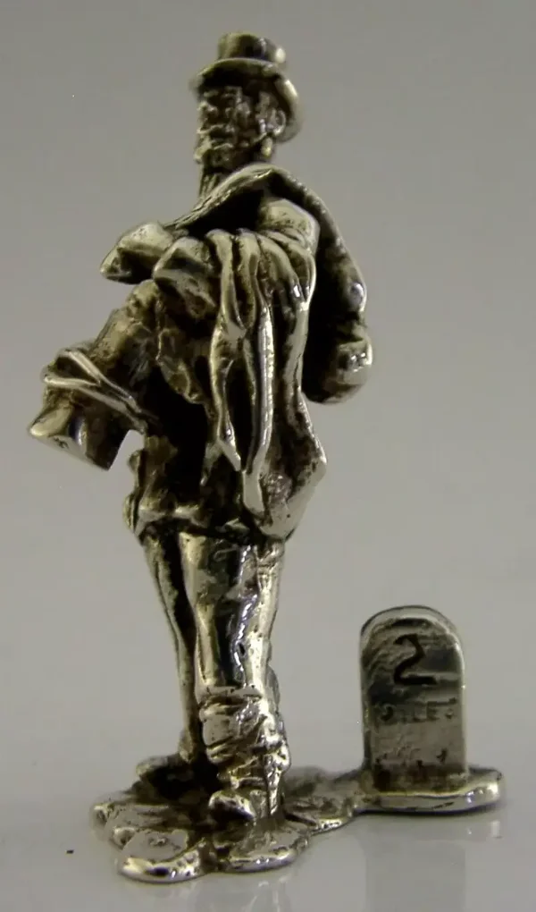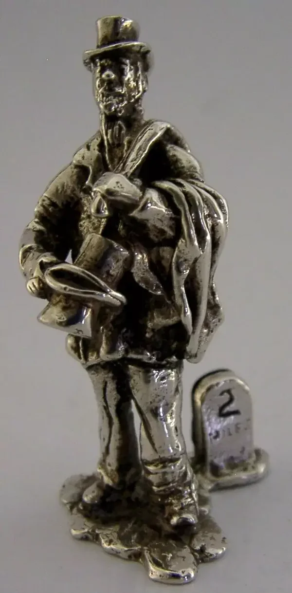 A superb rare English solid sterling silver place card or menu holder. It is hallmarked for London with the makers mark being that of Thomas Charles Jarvis. It has been superbly designed being cast in the form of a old clothes man with the milestone numbered 2, this holds the place card. There was a set produced by TC Jarvis - all Victorian street characters. It is in superb condition being free from dings splits and repairs. It measures approx. 2.25 inches (5.6cm) tall by 1.25 inches (3cm) across the base and weighs 50 grams. An interesting well made piece.