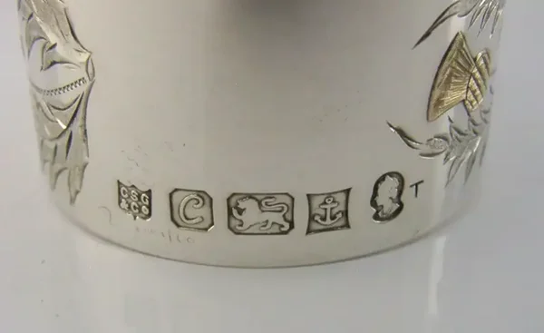 A lovely English solid sterling silver & gold napkin ring. It is hallmarked for London 1977 with the maker being Charles S Green & Co Ltd. It has been superbly made being decorated with three engraved Scottish thistle with applied gold detailing. It is in super condition being free from dings splits distortions and repairs. It measures almost 2 inches (4.7cm) across by over 1 inch (2.8cm) tall and weighs 40 grams excluding the box. A very high quality example.