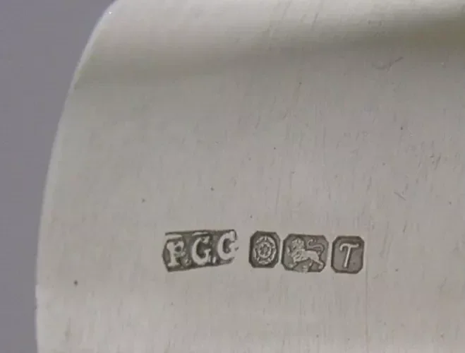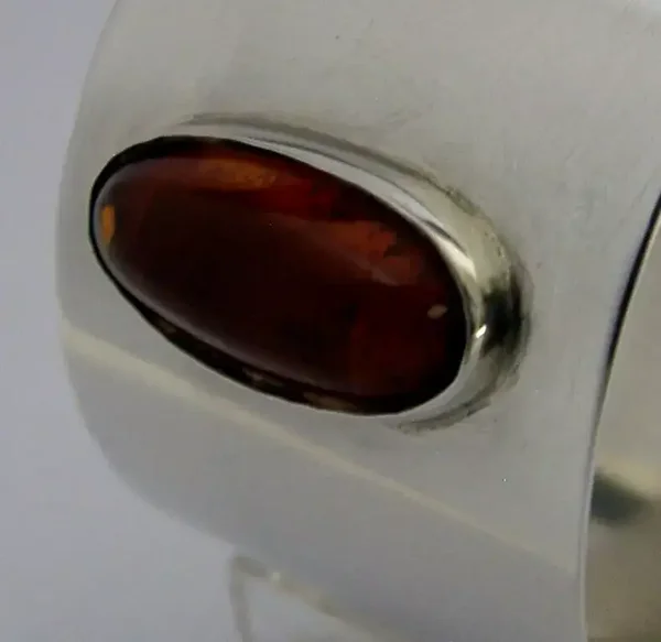 A beautiful English solid sterling silver and amber napkin ring. It is hallmarked for Sheffield 1993 with the makers marks being PGG. It has been beautifully designed being set with polished amber. It is in super condition being free from dings and repairs. It measures approx. 1.75 inches (4.7cm) across by 1.25 inch (3.2cm) tall and weighs 34 grams. A very nice quality piece.