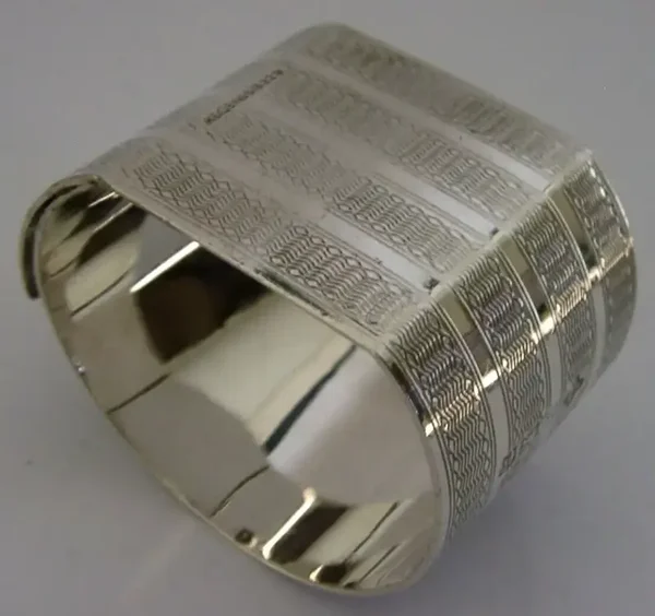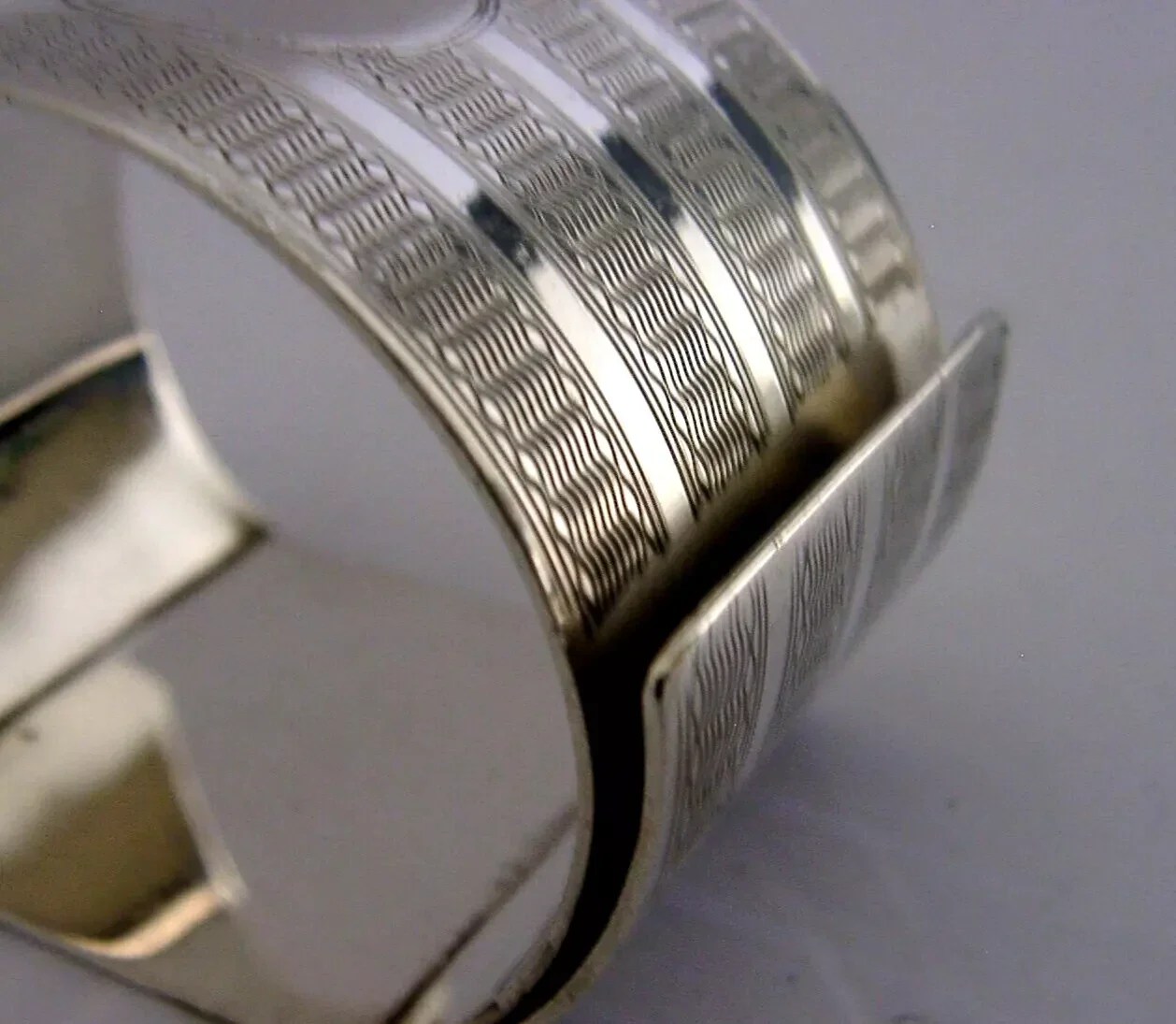 A rare and unusual English solid sterling silver combination napkin ring and place card / menu holder. It is hallmarked for Birmingham 1921 with the makers marks being that of William Base & Sons. It has been beautifully designed being nicely engine turned with a vacant cartouche. It is in superb condition being free from dings splits and repairs. It measures approx. 1.75 inches (5cm) across by 1.5 inches (3.9cm) tall by 1.25 inches (3.1cm) wide and weighs 34 grams. A very unusual piece.