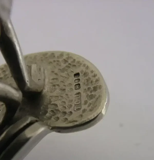 A superb novelty English solid sterling silver place card or menu holder. It is hallmarked London 1989 with the marker being Thomas Charles Jarvis. It has been superbly designed being cast in the form of a frog playing a violin. It is in superb condition being free from dings splits and repairs. It measures approx. 1.75 inches (5cm) tall by 1 inch (2.6cm) wide and weighs 26 grams. A interesting piece.