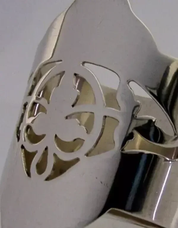 A superb solid sterling silver napkin ring. It is hallmarked for Birmingham 1943 (mid WWII so I figure not everyone was struggling) with the maker’s marks being L.Ld. It has been very unusually designed having a broad front beautifully pieced. It is in super condition being free from dings splits distortions and repairs. It measures approx. 2.25 inches (5.6cms) tall at the font by 1.5 inches (4.5cms) wide by 1.25 inches (3.5cms) front to back. It weighs 33 grams. A nice quality piece.