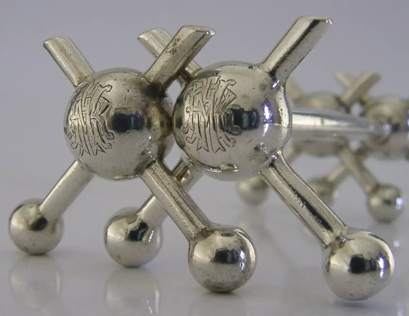 A rare set of Victorian antique solid sterling silver cutlery rests. They are hallmarked for Sheffield 1896 with the makers marks being that of Walker and Hall. They have an unusual ball design associated with Christopher Dresser. They are in super condition being free from dings splits and repairs. One end of each has been engraved AMR, RMA, MRA, MAR, etc...as the initials are entwined. They measure approx. 3.75 inches (9.3cms) long by 1.25 inches (3.5cms) tall and combined weigh 116 grams. Super quality rare examples.