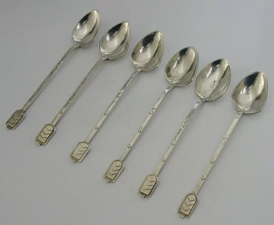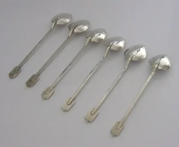 A beautiful set of six solid silver Arts & Crafts spoons. They are unmarked but test as high grade silver and I would date them to c1940s. They have been beautifully hand made being plannished and are in superb condition being free from dings splits and repairs. They measure approx. 4.75 inches (11.8cm) long by over 0.75 inch (2.4cm) wide and have a combined weight of 80 grams. Beautifully made examples.