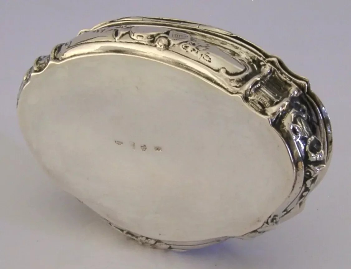 A beautiful German Hanau solid silver table box. It is hallmarked with the German 800 standard mark along with Hanau makers mark for Gebruder Neumann - I would date it to c1900-1920s. It has been superbly made being cast with a classical design. It is in super condition being free from dings splits holes and repairs, the inside is clean. It measures approx. 5 inches (12.6cm) across by over 3 inches (8cm) wide by 1.5 inches (4cm) tall and weighs 156 grams. A very pretty piece.