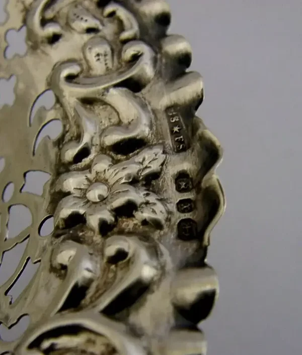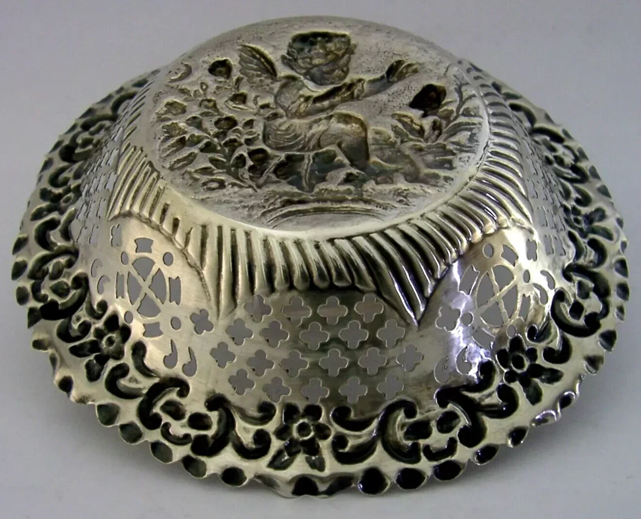 A beautiful English Victorian solid sterling silver dish or bowl. It is hallmarked for Birmingham 1897 with the maker being CF FS. It has been superbly designed being embossed with a cherub and butterfly scene. It is in superb condition being free from dings splits holes and repairs. It measures approx. 4.5 inches (11.7cm) across by 1 inch tall and weighs 44 grams. A very pretty piece.