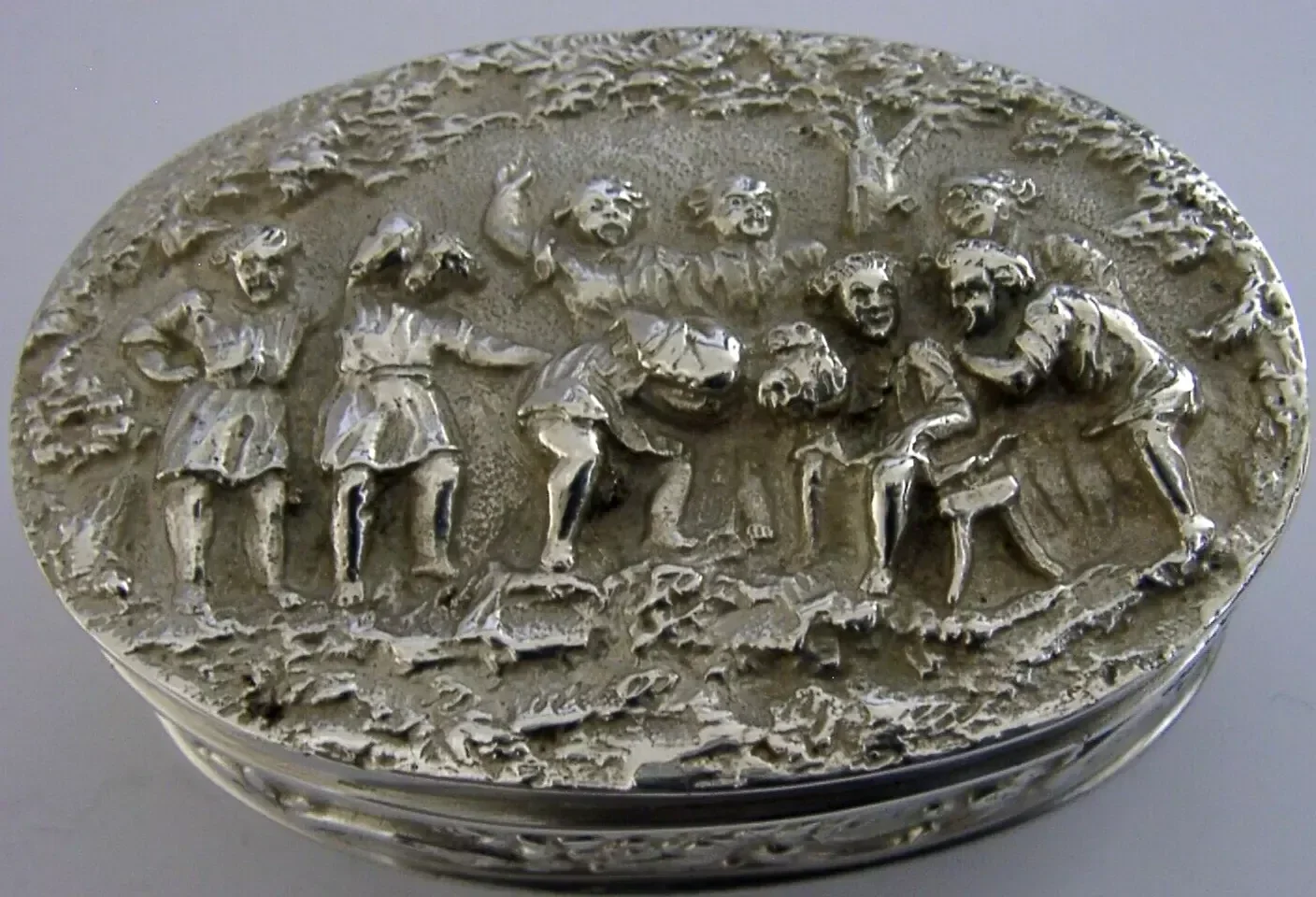 A very unusual German Hanau export solid silver table snuff or trinket box. It is hallmarked with German Hanau makers marks and tests as high grade silver. I would date it to c1900. It has been superbly made being cast with a lid scene depicting what appears to be a boy getting spanked? It is in super condition being free from dings splits holes and repairs, the inside is clean and the lid closes tightly. It measures approx. 3 inches (7.5cms) across by 1.75 inches (4.7cms) wide by 1 inch (2.7cms) tall and weighs 77 grams. A very unusual piece.