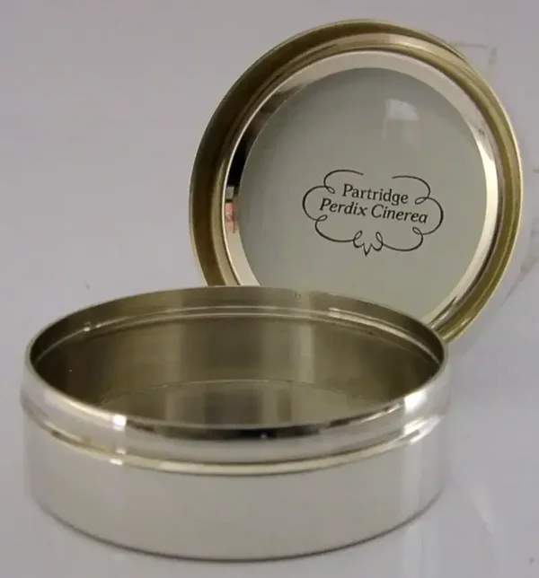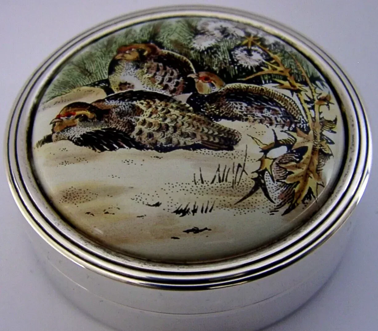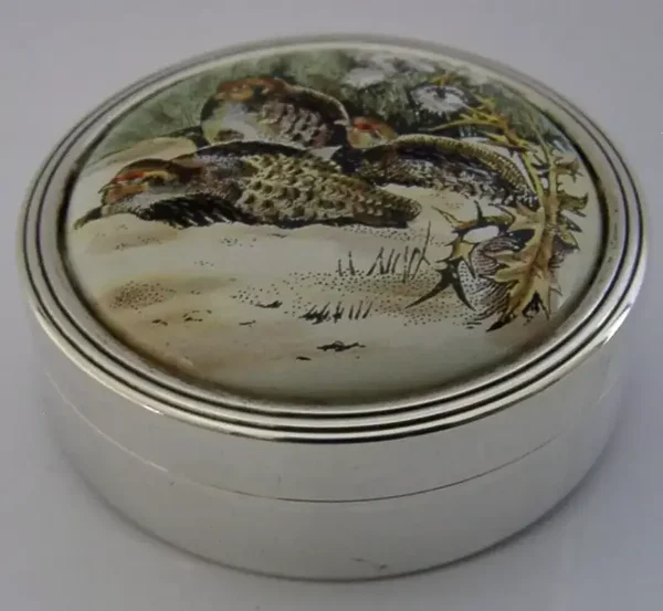 A beautiful high quality English solid sterling silver and ceramic enamel box. It is hallmarked for Birmingham 1982 with the makers marks being SJHC. It has been beautifully made being decorated with Partridges and is number 7 of a limited edition of 750. It is in superb condition being free from dings splits and repairs. No chips cracks or repairs to the enamel. The inside is clean. It measures approx. 2 inches (5.1cms) across by 1 inch tall and weighs 50 grams. A superbly made nice quality piece.