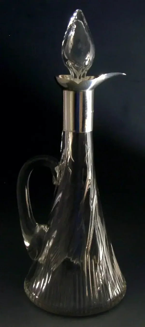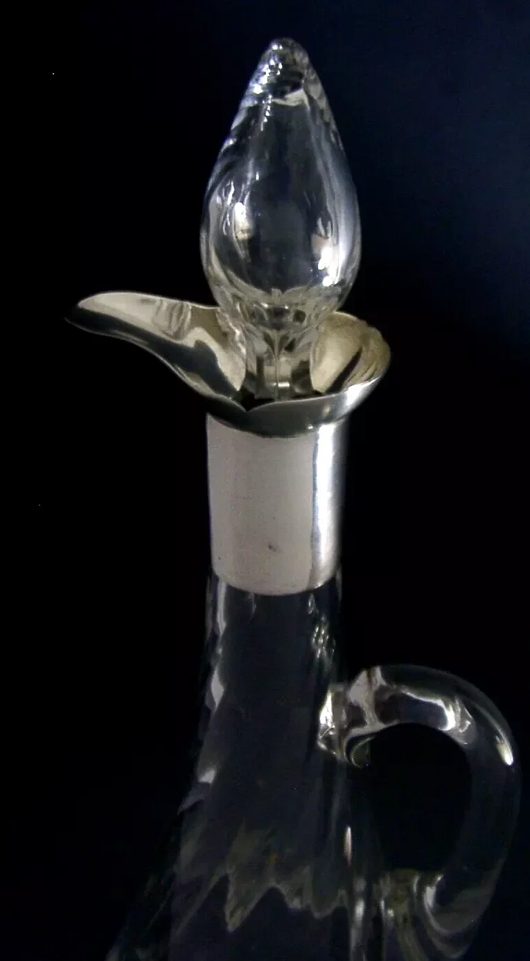 A beautiful high quality Victorian antique solid sterling silver and glass half sized decanter / noggin. It is hallmarked for Birmingham 1899 with the maker being Sanders & Aguilar. It has been stylishly Art Nouveau designed and is in super condition being free from dings splits and repairs just a tiny dimple to the collar and a shallow chip to the stopper base which is very easy to grind out - see final photo. It measures over 9.25 inches (23.8cm) tall by 3.5 inches (8.8cm) across the base and weighs 326 grams. A high quality example.