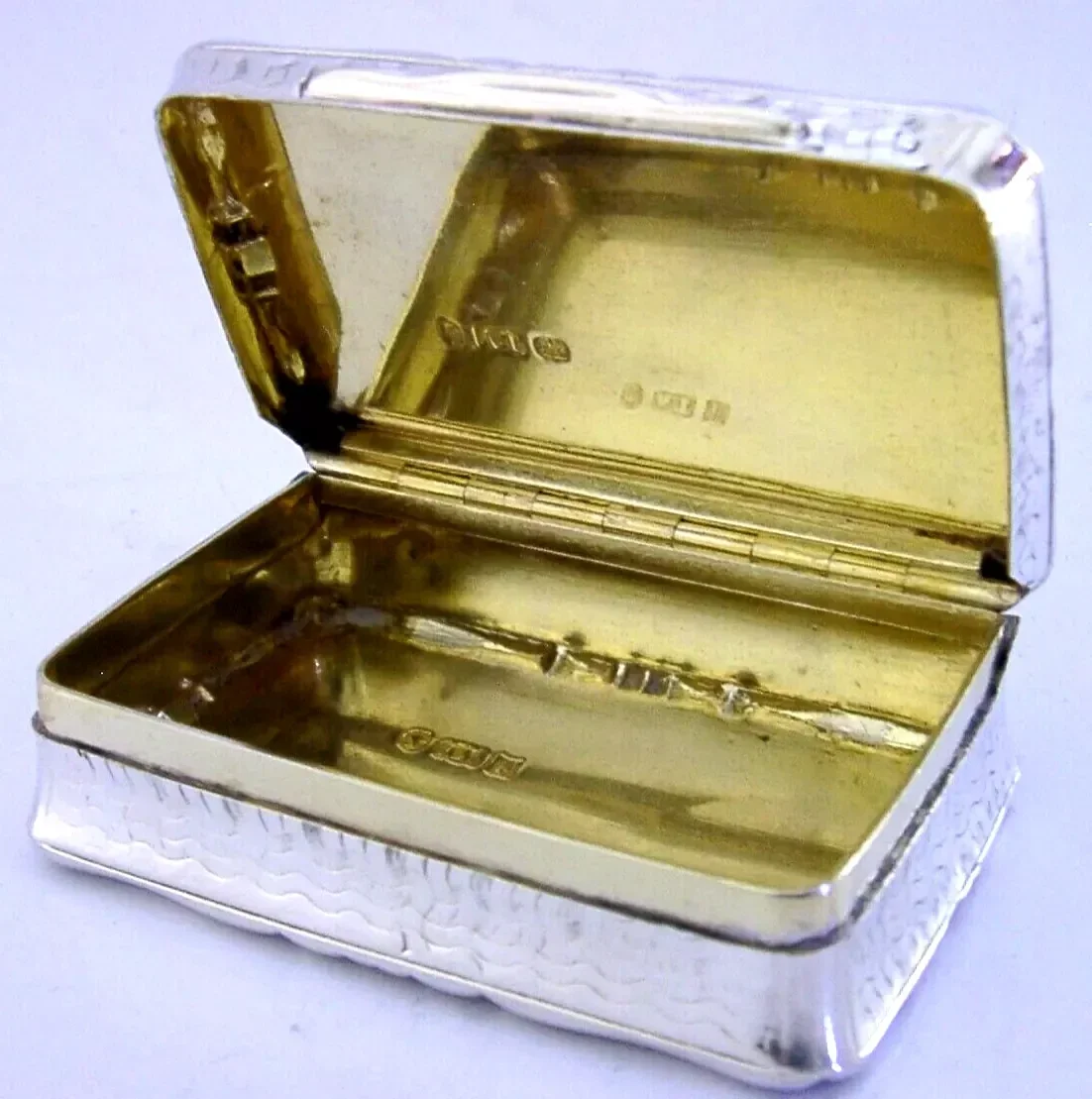 A beautiful English Victorian antique solid sterling silver table snuff box. It is hallmarked for London 1854 with the maker being Alfred Taylor. It has been superbly designed and internally gilded. It is in super condition being free from dings splits holes and repairs - slight wear to the engine turned detailing from 171 years use. The hinge is smooth and tight, the inside gilded and clean. It measures approx. 2.75 inches (6.9cm) long by over 1.75 inches (4.7cm) wide by over 0.75 inch (2.2cm) tall and weighs 66 grams. A high quality example.