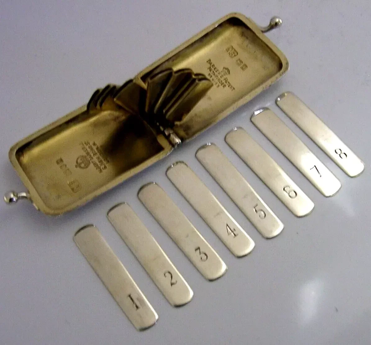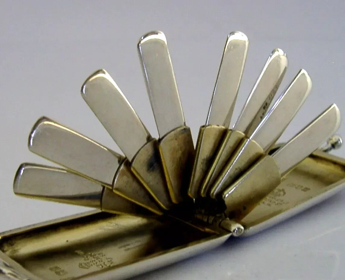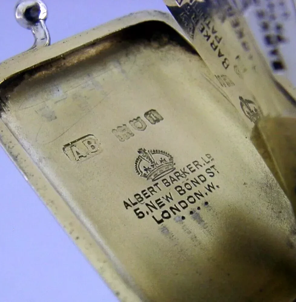 A very rare English Edwardian antique solid sterling silver butt marker box. It is hallmarked for London 1906 with the maker being Albert Barker Ltd. It has been superbly designed and has been engraved with the initials MP. It is in super condition being free from dings splits distortions and repairs. The hinge is smooth and tight. It measures approx. 12 inches (5cm) long including the clasp by 1.25 inches (3.2cm) wide and weighs 38 grams. A very high quality rare piece.