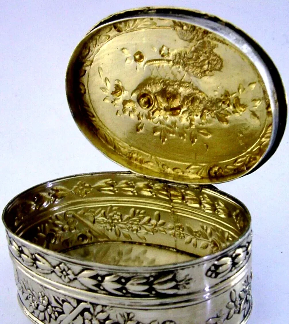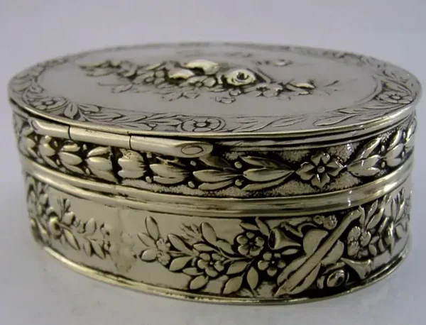 A beautiful antique German Hanau solid silver table box. It is hallmarked with the German Hanau 830 standard mark and the makers mark of Vereinigte Silberwarenfabriken. I would date to c1910. It has been beautifully made with the lid depicting a flower basket. It is in super condition being free from dings splits holes and repairs, a tiny little base mark (see final photo), the inside is clean and the lid closes tight. It measures approx. 3 inches (7.5cm) across by and weighs 66 grams. A beautiful piece.