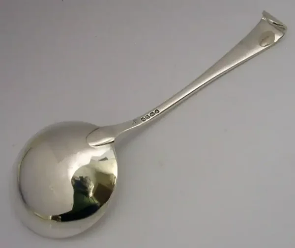 A very good quality well made English Victorian solid sterling silver sauce or gravy ladle. It is hallmarked for London 1889 with the makers mark being JA TS. It has been superbly made unusually having a hooked end and has been engraved with a Greyhound crest used by the Hunter Family. It is in superb condition being free from dings splits and repairs. It measures approx. 7 inches (17.5cm) long by 2.25 inches (5.6cm) wide and weighs 62 grams. A high quality very interesting piece.