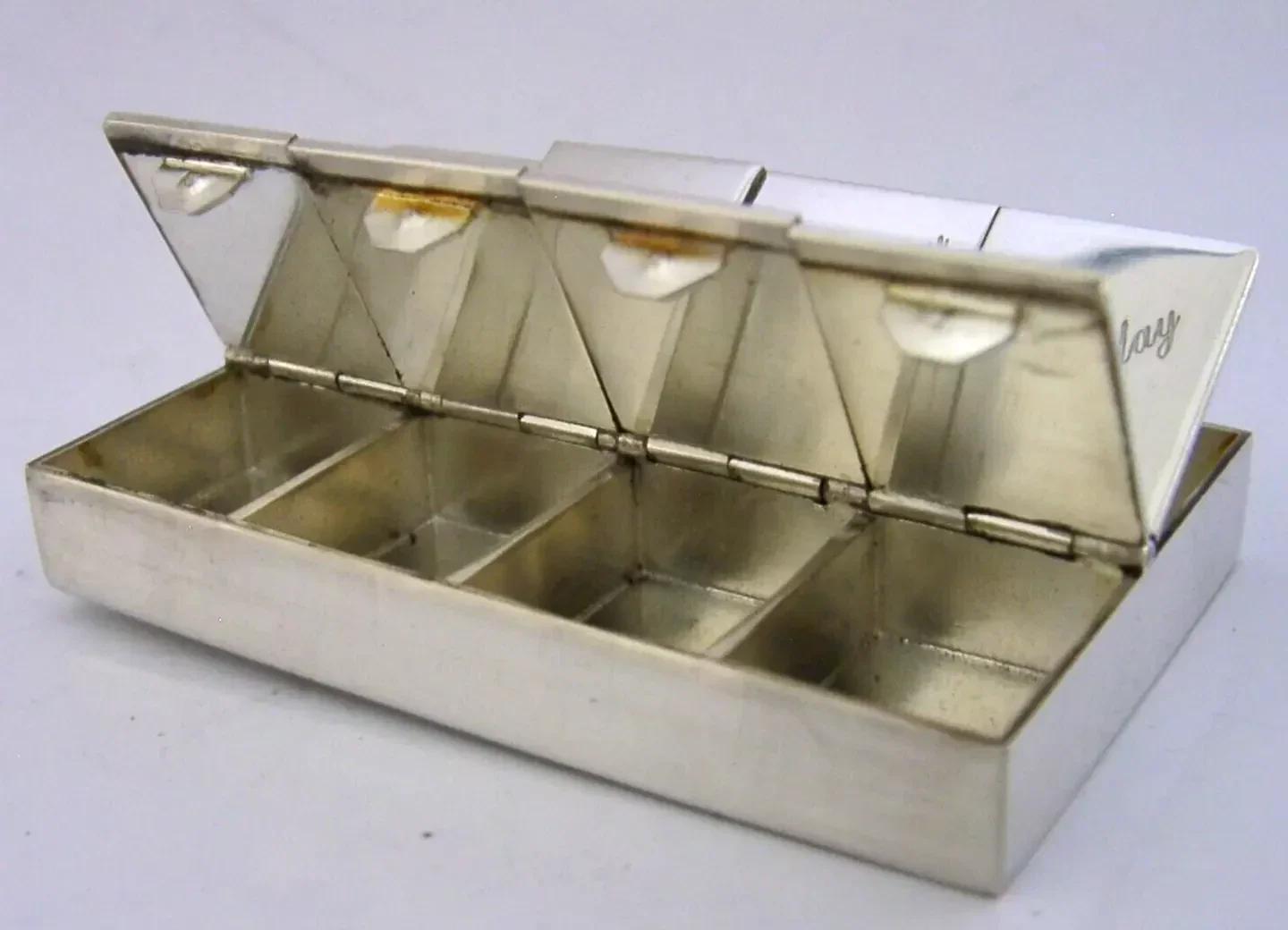 A stylish solid sterling silver multi compartment pill box. It is hallmarked with Italian silver marks along with the English import marks for London 2006 along with the importers mark being Penhaligon's. It has been superbly made and is in super condition being free from dings splits holes and repairs, the inside is clean, the compartments close tightly. It measures approx. 2.75 inches (6.9cm) long by 1.75 inches (4.4cm) wide by 0.5 inch (1cm) and weighs 92 grams. A very well made piece.