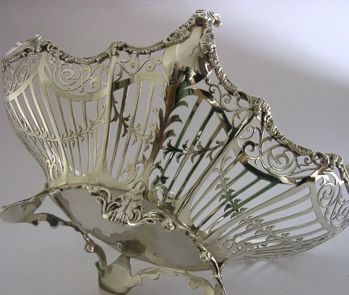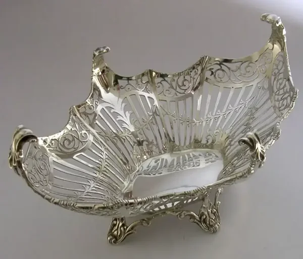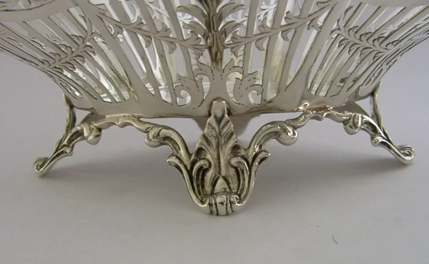 A beautifully large English antique solid sterling silver bowl. It is hallmarked for London 1920 with the maker being Josiah Williams & Co (David Landsborough Fullerton). It has superbly designed with the sides being pierced and the base being cast. It is in superb condition being free from dings splits engravings and repairs. It measures approx. 10.75 inches (27.3cm) across by 8 inches (20.2cm) wide by 5.5 inches (14cm) tall and weighs 450 grams. A very good quality well made piece.
