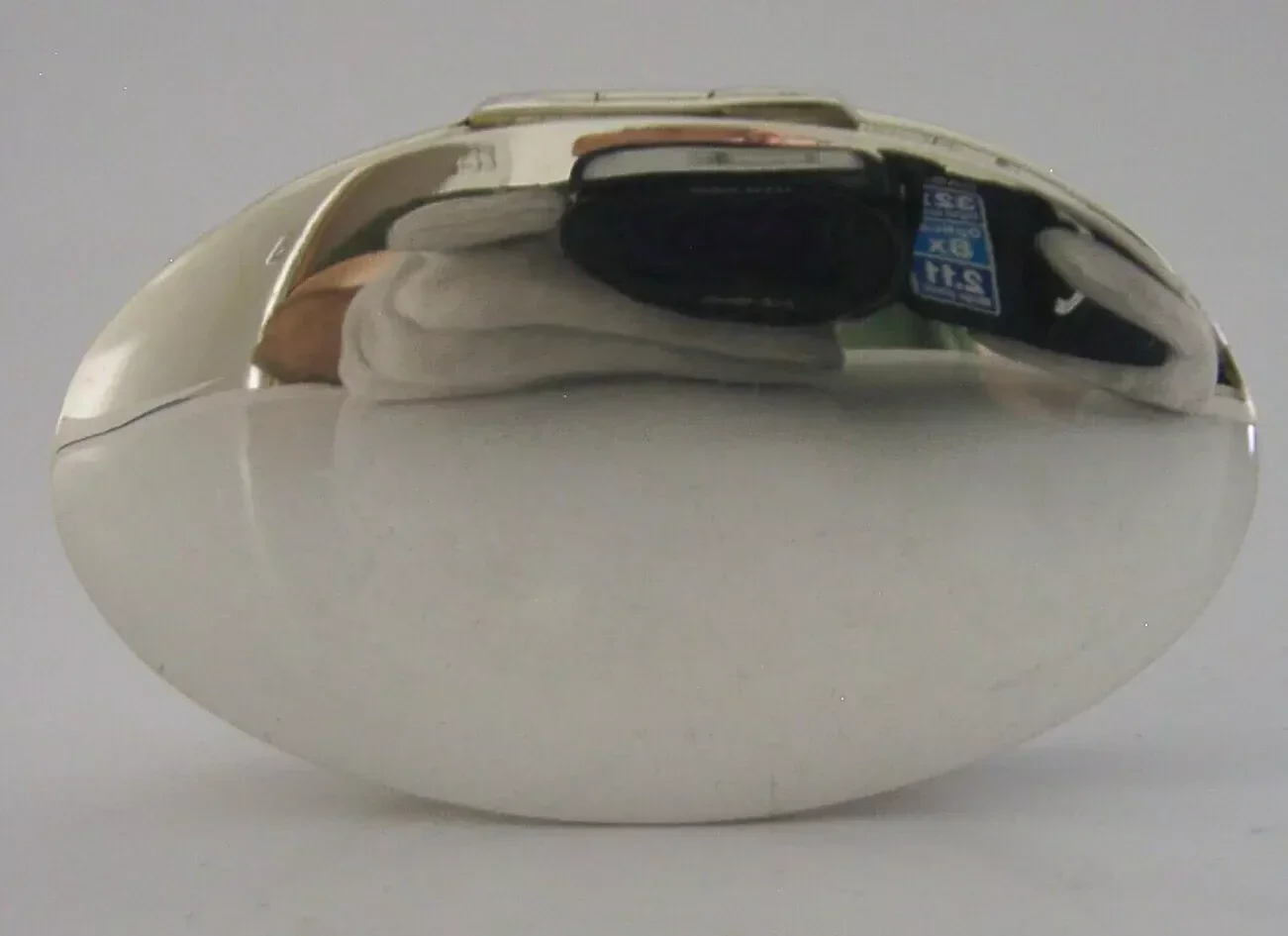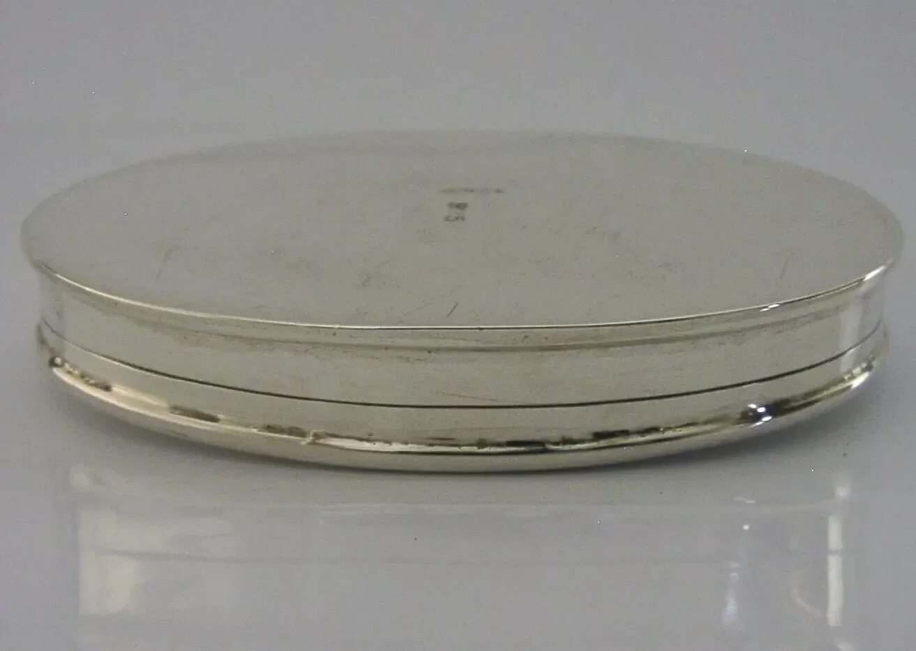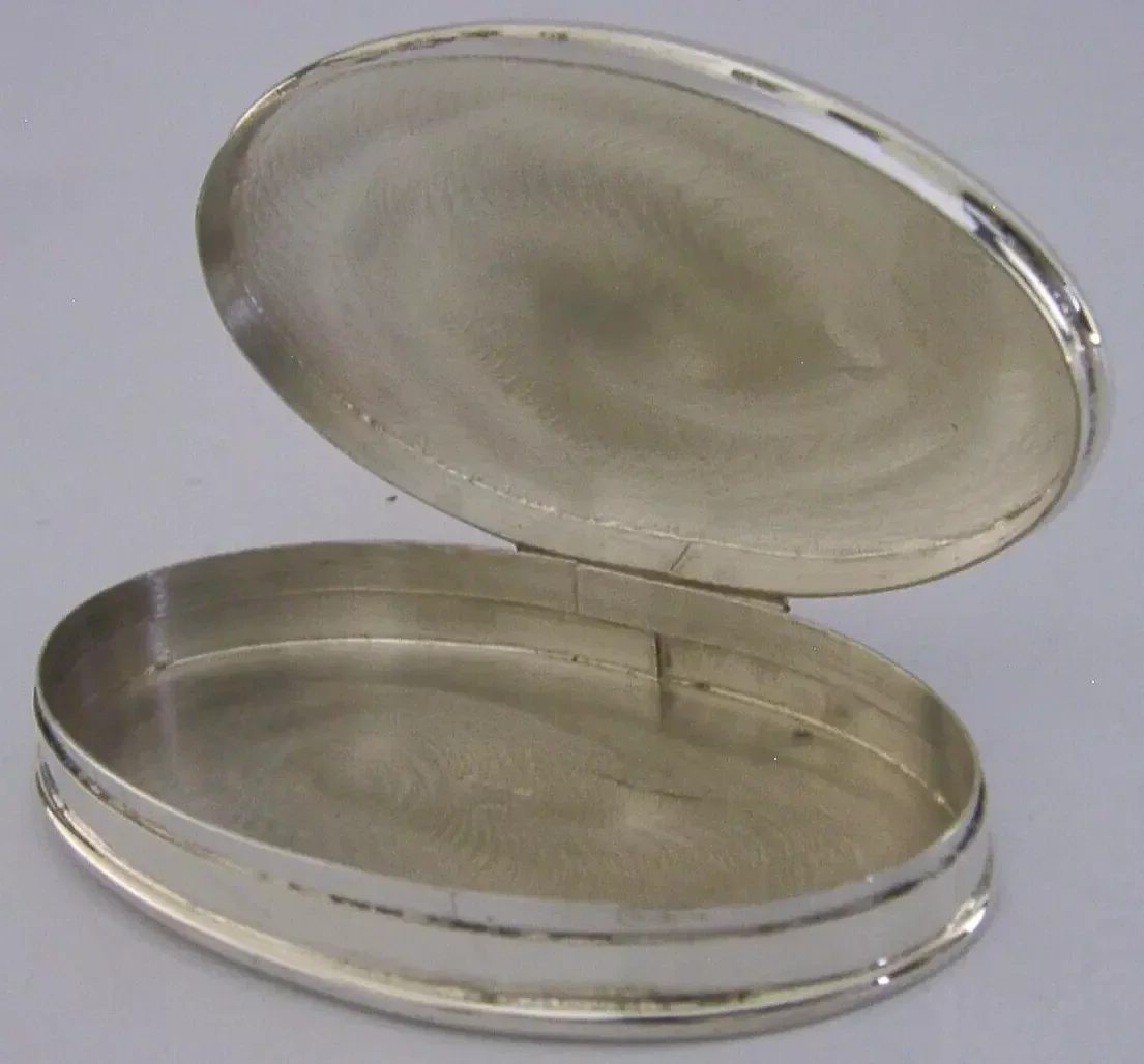 A stylish English solid sterling silver box. It is hallmarked for London 2000 with the maker’s marks being HJ. It has been stylishly designed being oval in form and is in super condition being free from dings splits holes and repairs. The inside is clean and it closes tightly. It measures approx. 2.75 inches (7cms) long by almost 1.75 inches (4.2cms) and weighs 38 grams. A well made clean piece.