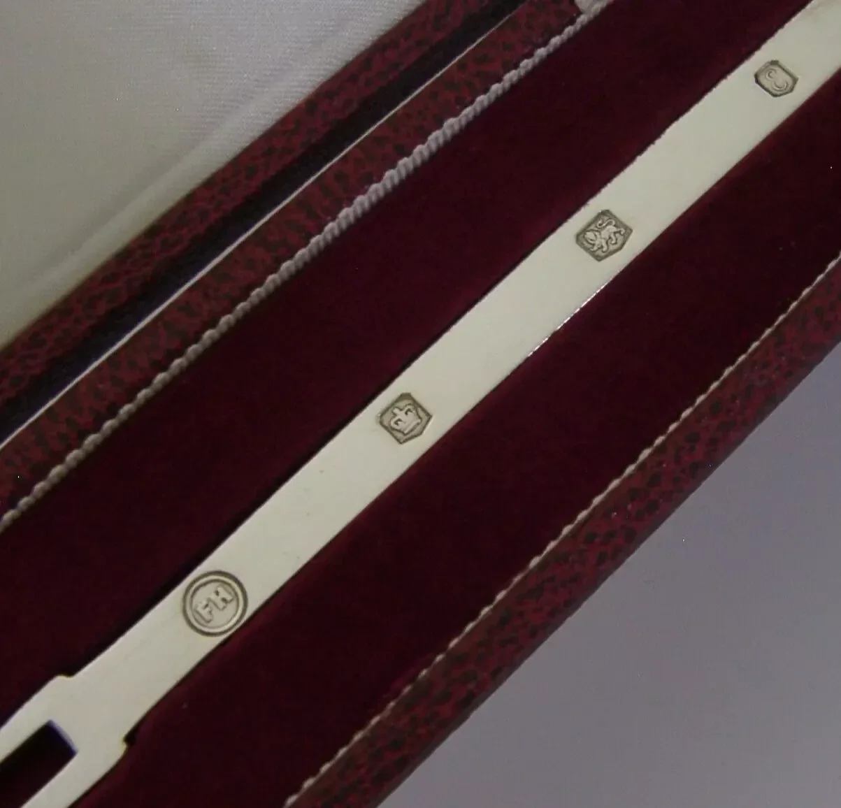 A super quality cased English solid sterling silver pickle fork. It is hallmarked for Sheffield 1972 with the maker’s marks being that of Francis Howard Ltd. It has been superbly made being a replica of the Manners Fork of 1632, the earliest English hallmarked fork. It is in super condition being free from dings splits distortions and repairs, the box its also great. It measures approx. 7 inches (17.7cms) long by almost 0.5 inch (1cm) wide and weighs 42 grams excluding the case. A very well designed mint piece.