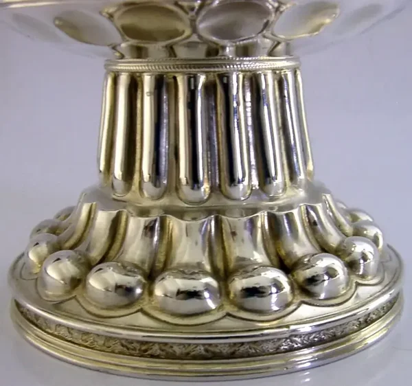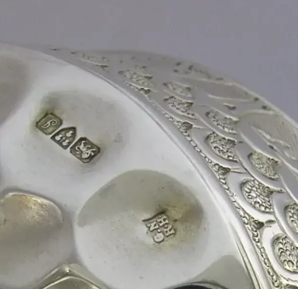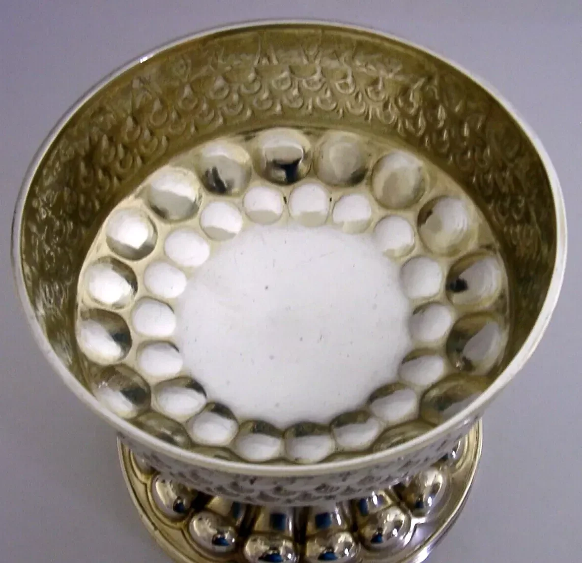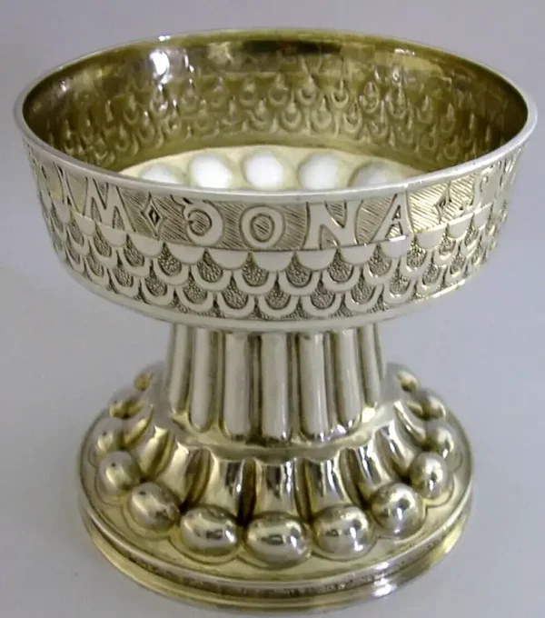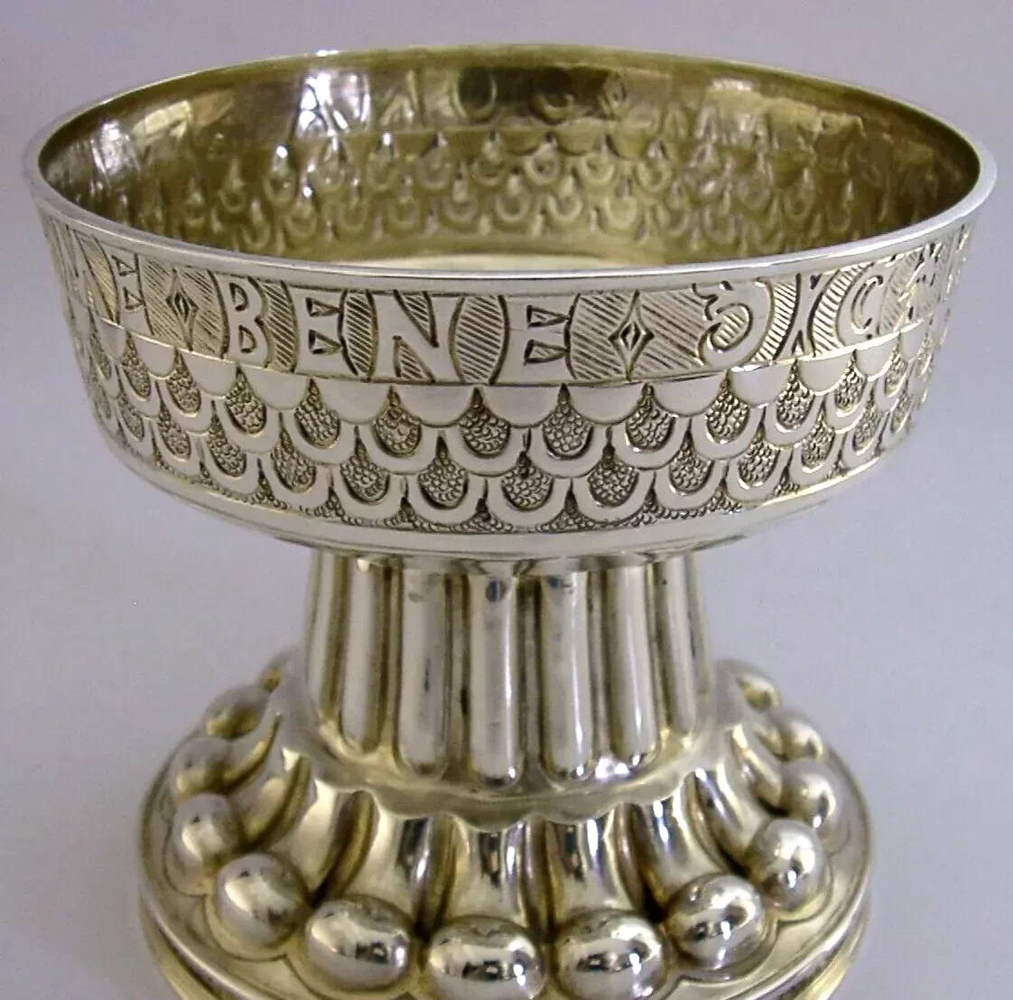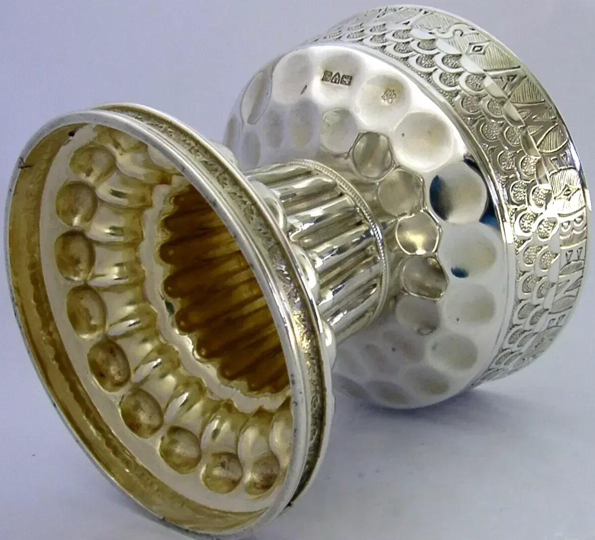 A rare and beautiful large English antique solid sterling silver chalice. It is hallmarked for Chester 1909 with the maker being George Nathan & Ridley Hayes, retailed by Dobsons of Piccadilly London. It has been superbly handmade in a Medieval style and is in superb condition being free from dings splits distortions and repairs, possibly once completed gilded (base underside still gilded) - but this is nothing of note. It measures approx. 4.25 inches (10.5cm) tall by 4.5 inches (11.3cm) across the rim and weighs 355 grams. A very good quality beautiful piece.