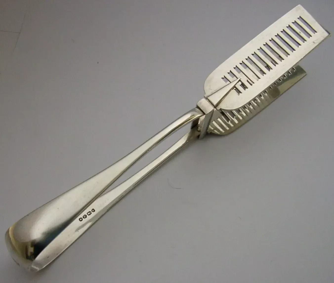 High quality English Victorian antique solid sterling silver asparagus, vegetable, or sandwich serving tongs. They are hallmarked for London 1885 with the maker being John Aldwinckle & Thomas Slater. They have been engraved with a unusual crest of 'a rock ppr' - used by both the Walkerand Bradwell Families. They are highly sprung and in good working order. They are in superb condition being free from dings splits distortions and repairs. They measure approx. 9.25 inches (23.5cm) long by over 1 inch (3.1cm) wide across the grips and they weigh an impressive 160 grams. Super quality examples.