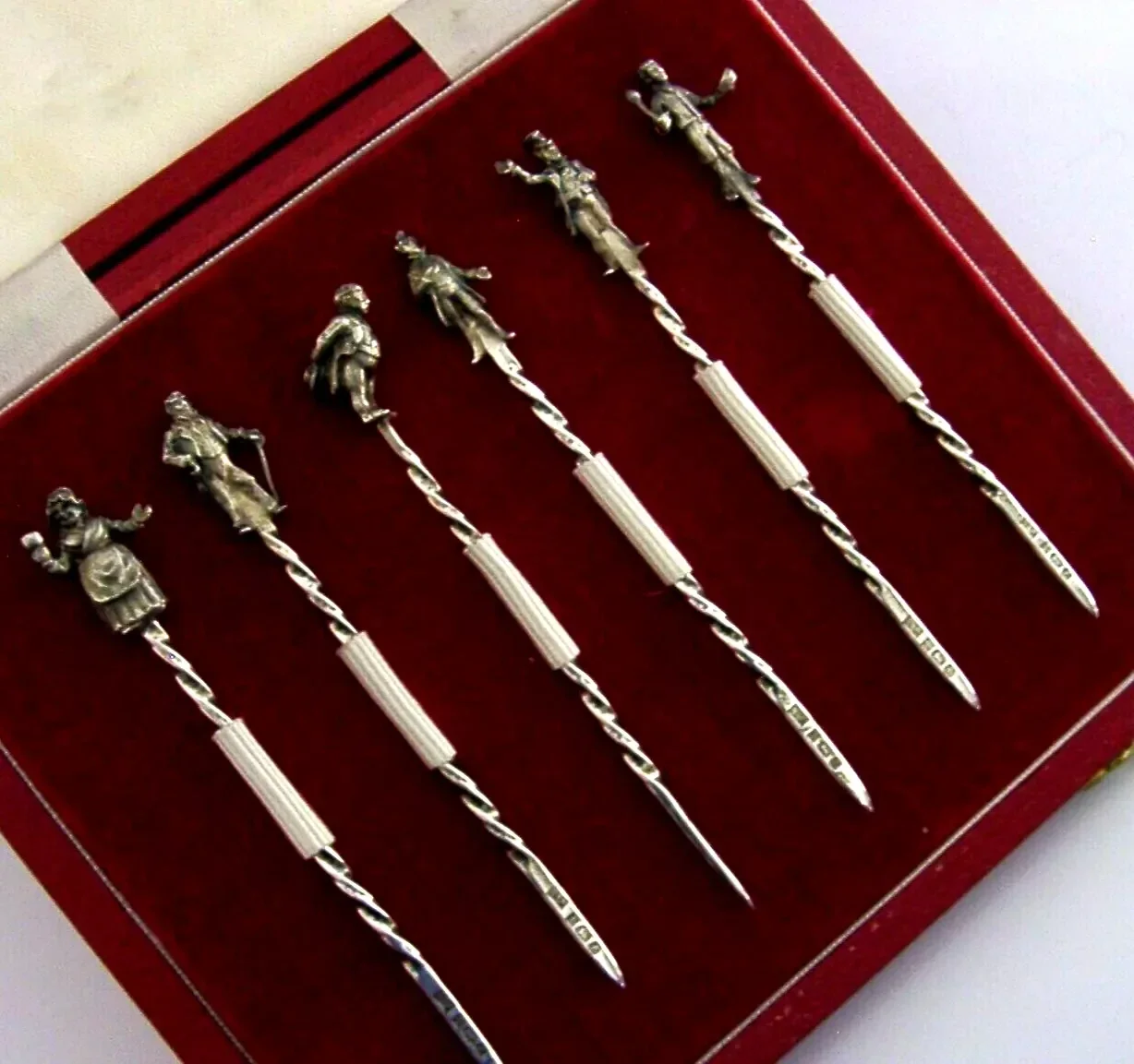 A beautiful rare cased set of six solid sterling silver cocktail sticks. They are all hallmarked for Birmingham 1985 with the maker mark being Bishton's Ltd. They have been beautifully designed with the terminals being cast in the form of various Charles Dickens characters. They are in superb condition being free from dings splits and repairs. The case is also superb. They measure approx. 3.75 inches (9.2cm) long and have a combined weight of 32 grams excluding the case. A beautifully designed set.