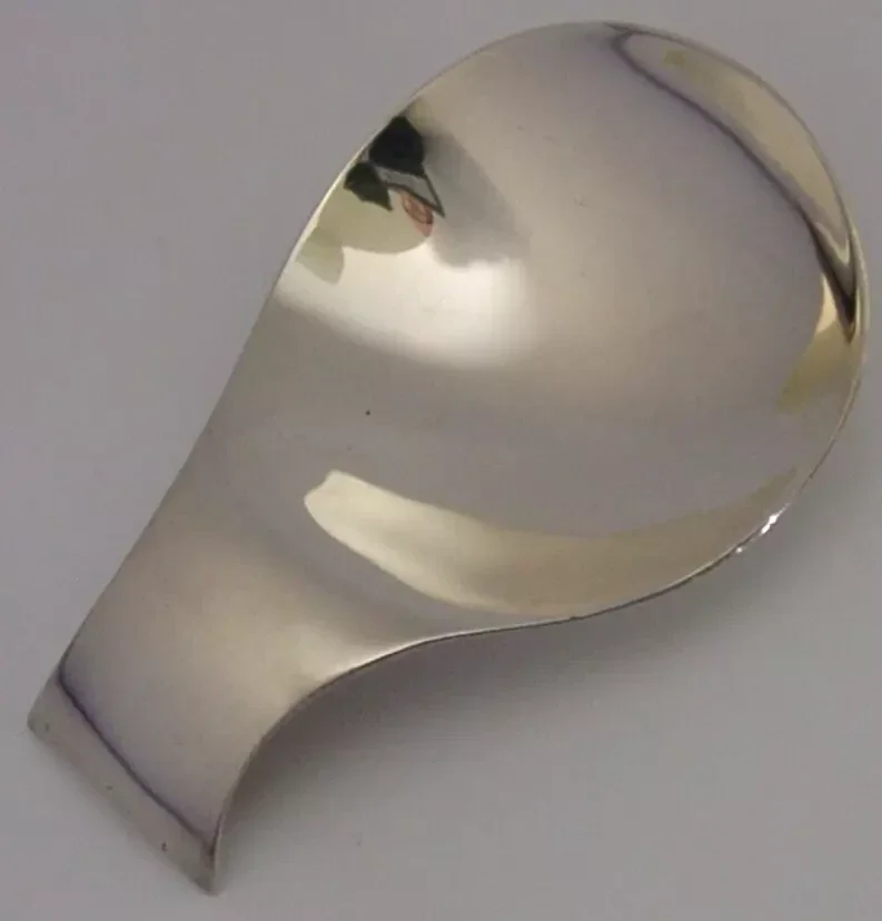 A super quality unusual English solid sterling silver modernist caddy spoon. It is hallmarked for Birmingham 1989 with the maker's mark being A E Jones. It has been superbly made and is in super condition being free from dings splits distortions and repairs. It measures approx. 2.75 inches (7cm) long by 1.75 inches (4.5cm) wide and weighs 16 grams. A very nice example.