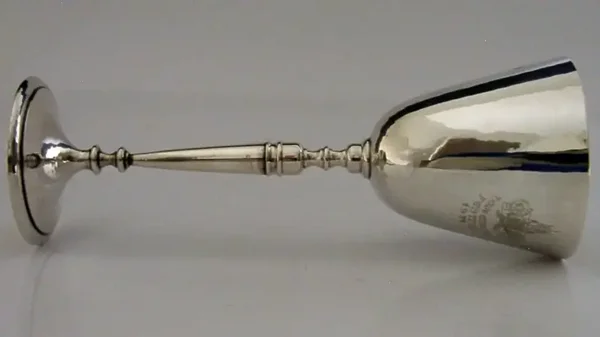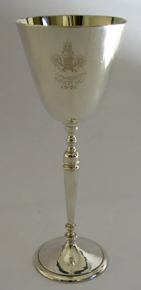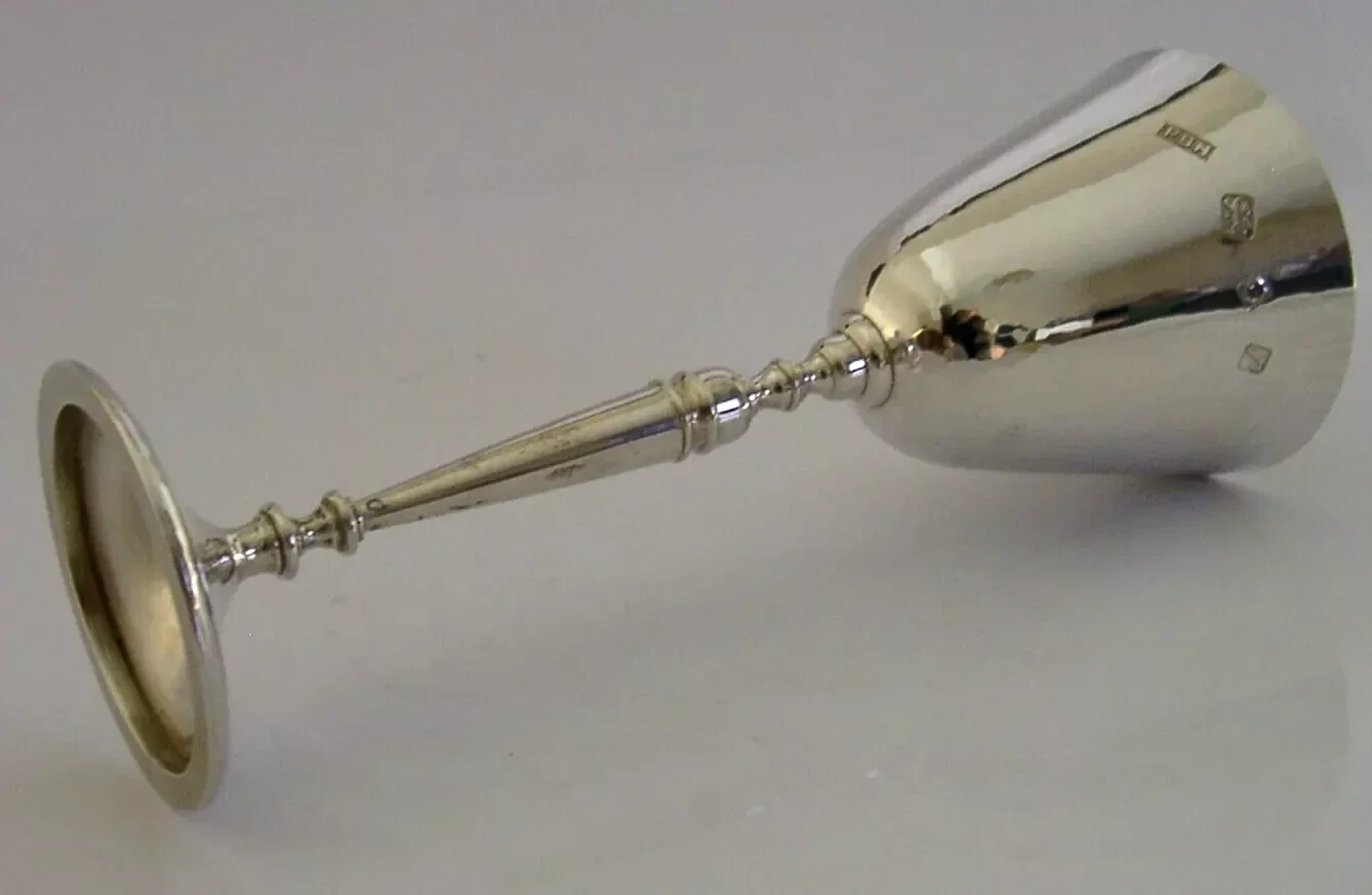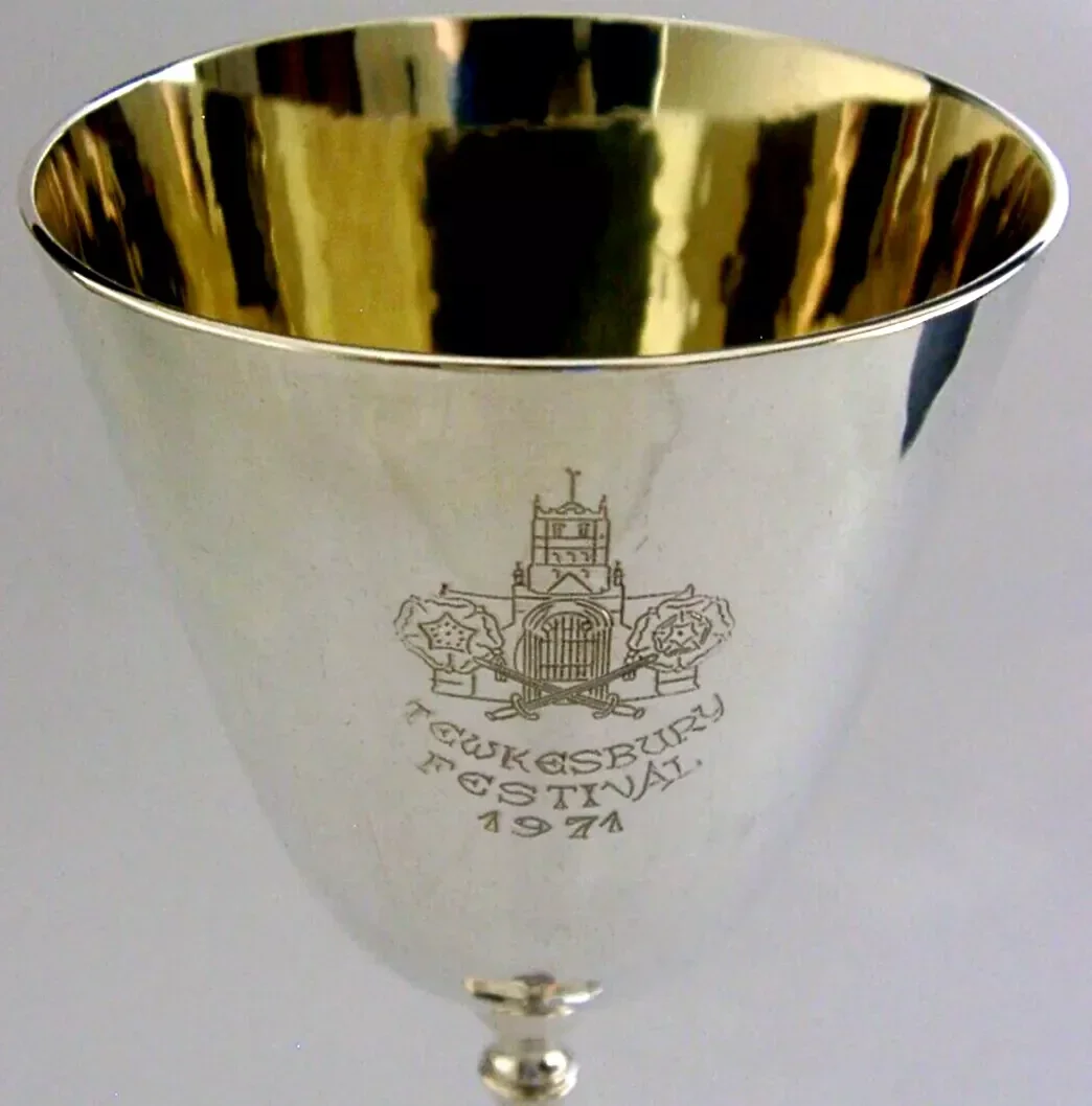 A beautiful English solid sterling silver wine goblet. It is hallmarked for London 1971 with the makers marks being PBH for Peter Harwood of Cheltenham. It has been superbly designed being hand plannished. It was made for the Tewkesbury Festival of 1971 made in limited numbers, this being number 177. It holds 80ml. It is in superb condition being free from dings splits distortions and repairs. It measures approx. 6.5 inches (16.4cm) tall by 2.5 inches (6.1cms) across the rim and weighs 142 grams. A very good quality well made interesting piece.