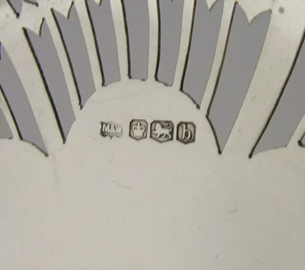 A beautiful English antique solid sterling silver dish or bowl. It is hallmarked for Sheffield 1919 with the maker being Mappin & Webb. It has been beautifully designed being ornately pierced. It is in superb condition being free from dings splits holes and repairs. It measures approx. 6.5 inches (16.6cm) across by 1.75 inches (4.8cm) tall and weighs 186 grams. A very pretty piece.