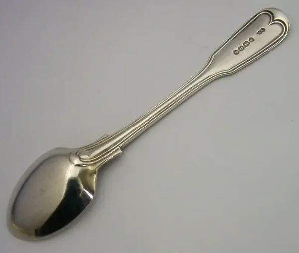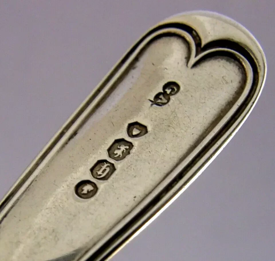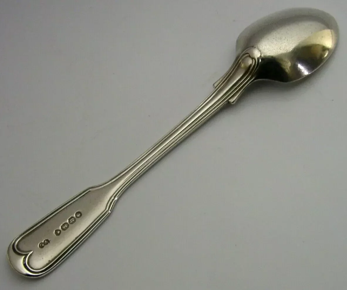 A superb rare English antique solid sterling silver egg spoon. It is hallmarked for London 1863 with the makers mark being GA. It has been superbly made being interestingly engraved with a crest used by the Hamilton Family as well as the Ickyll and Studholme Family's. It is in superb condition being free from dings splits distortions and repairs. It measures approx. 5 inches (12.7cm) long and weighs 22 grams. A super quality example.
