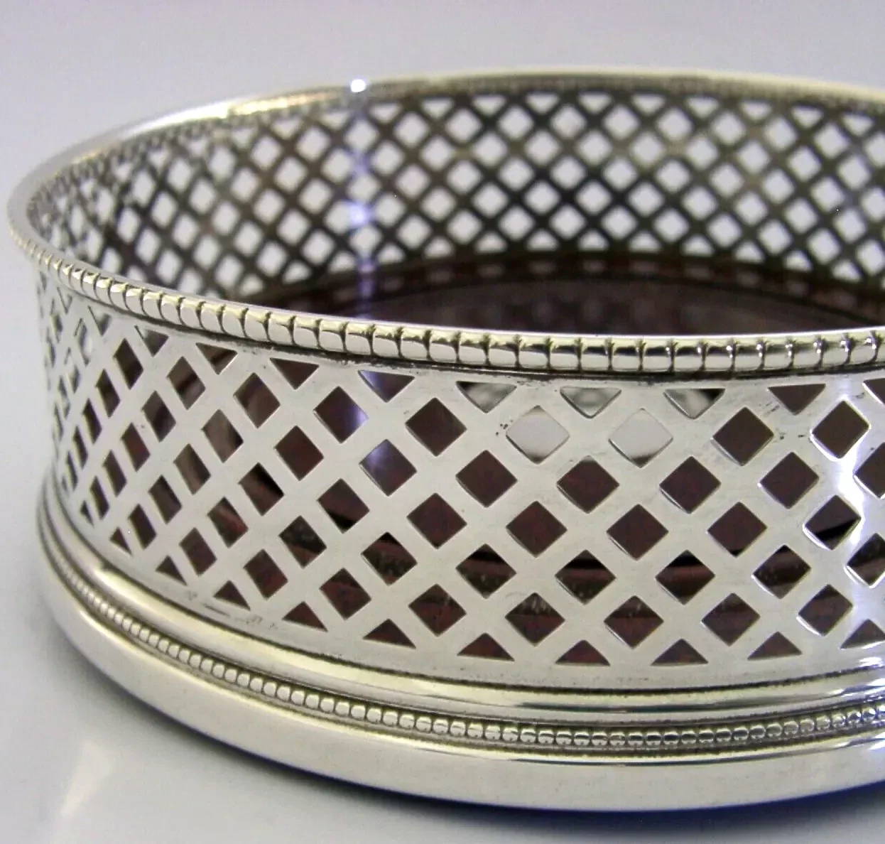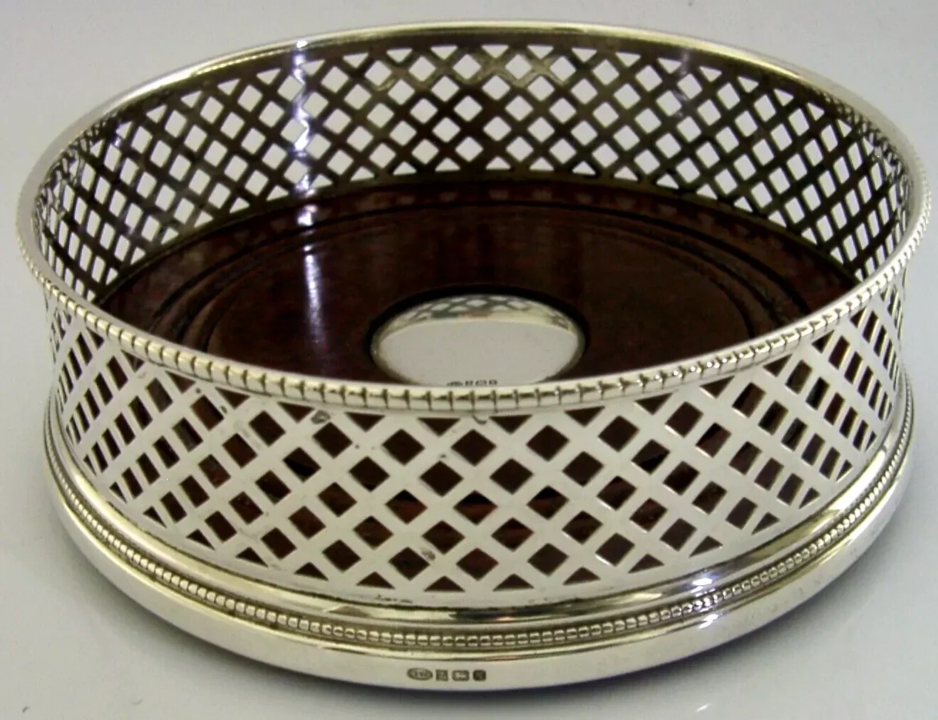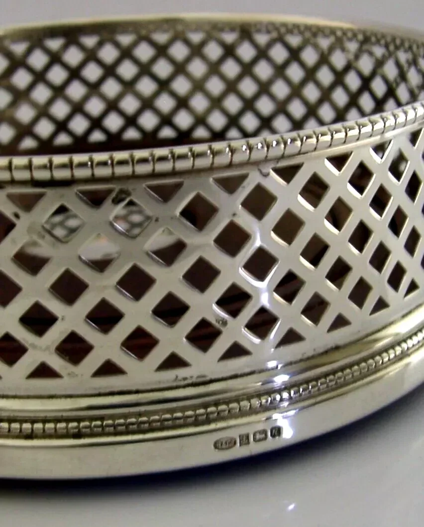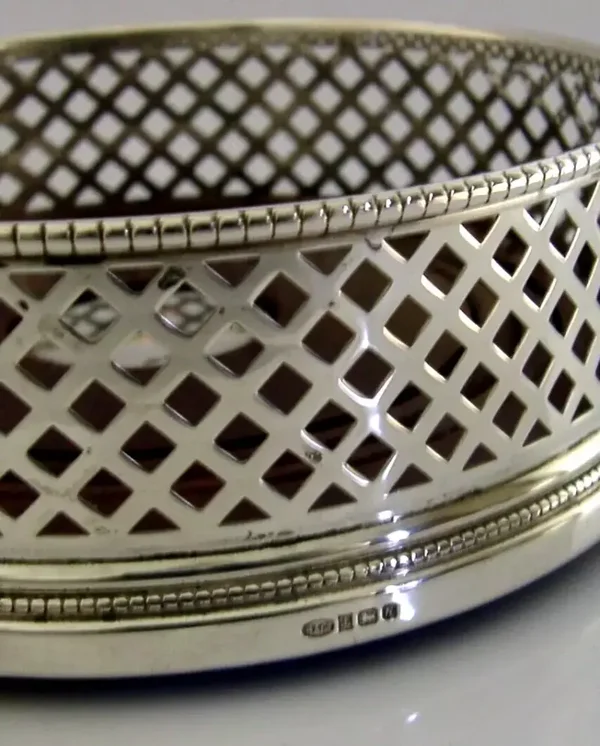 A super quality mint English solid sterling silver wine or campaign bottle coaster. It is hallmarked for Birmingham 1991 with the maker being W I Broadway & Co. It has been superbly made with the sides being pierced. It is in superb condition being free from dings splits and repairs. It measures approx. 5 inches (12.6cm) across by 1.75 inches (4.4cm) tall and weighs 160 grams. A very nice quality clean piece.