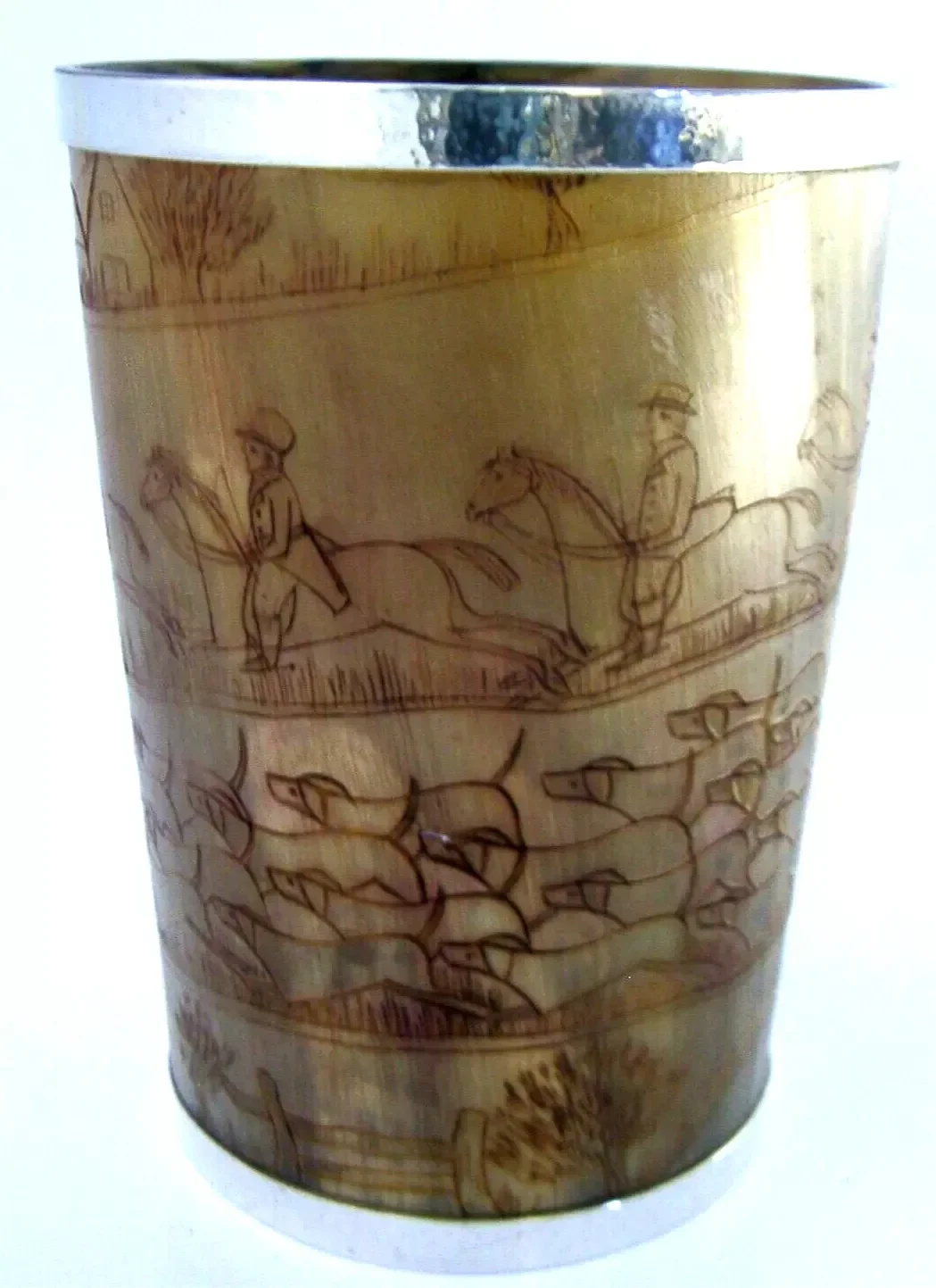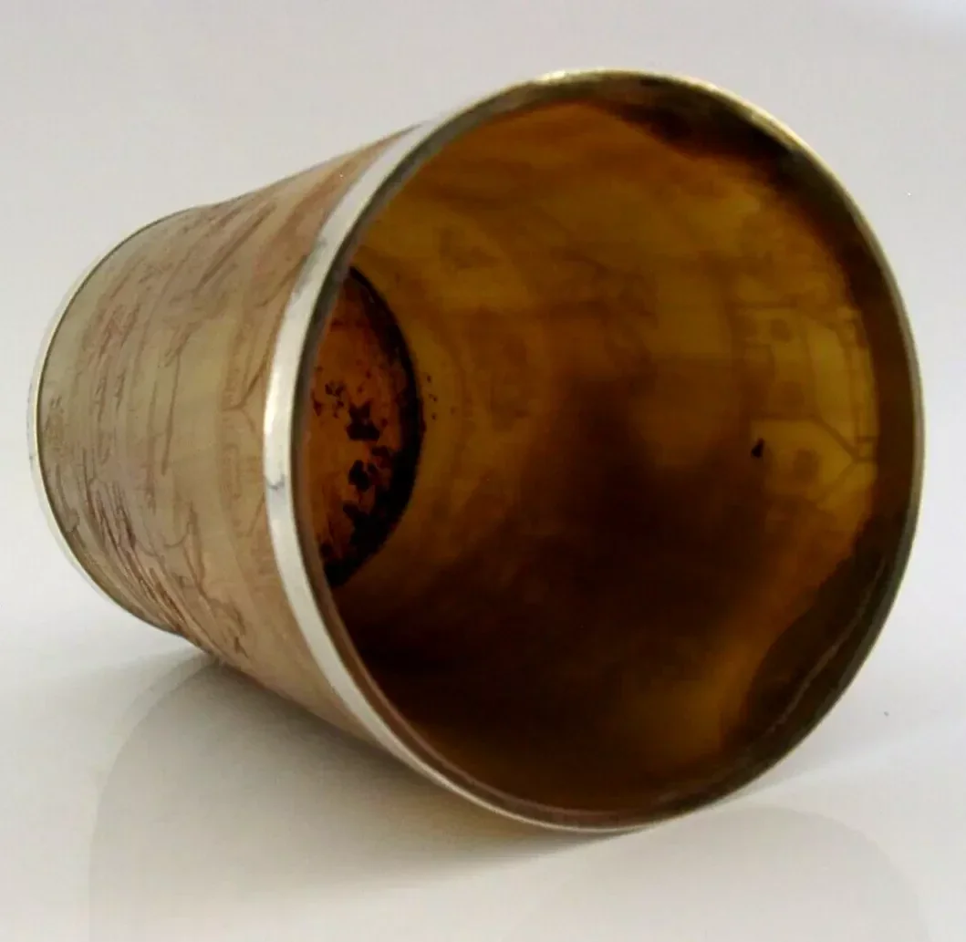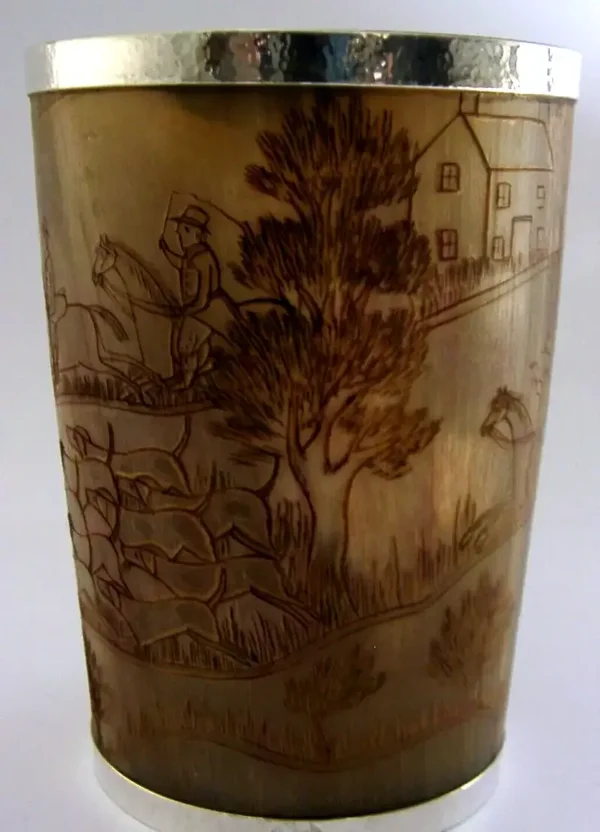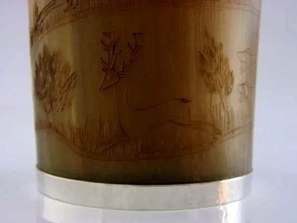 A superb large solid sterling silver rimmed hunting beaker. Its rims are silver, unmarked, but tested. I would date it to the mid to late 19th century by the style of dress. It has been engraved with a detailed stag hunting scene. It is in superb condition being free from dings splits holes chips cracks and repairs. It measures approx. 4.75 inches (12cm) tall by 3.5inches (8.5cms) across the rim and weighs 192 grams. A superbly made very high quality piece.