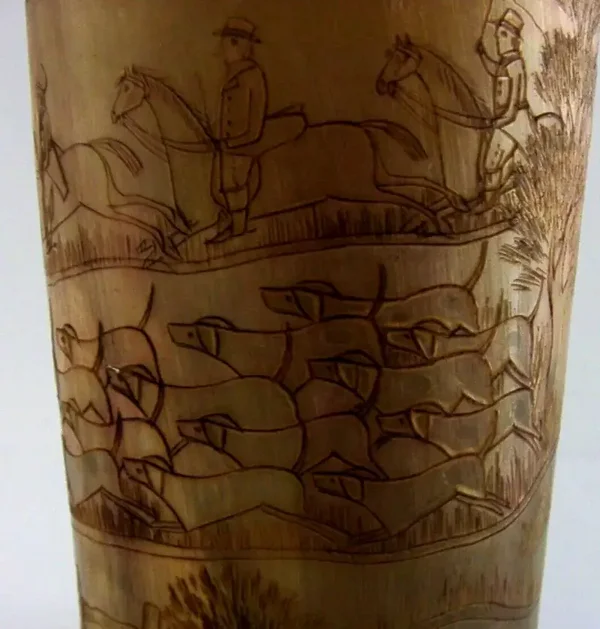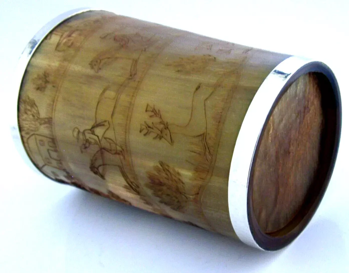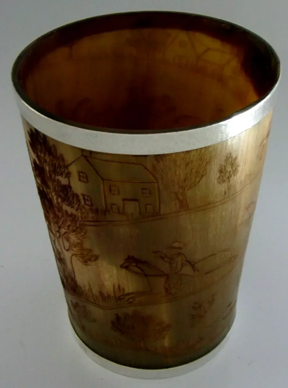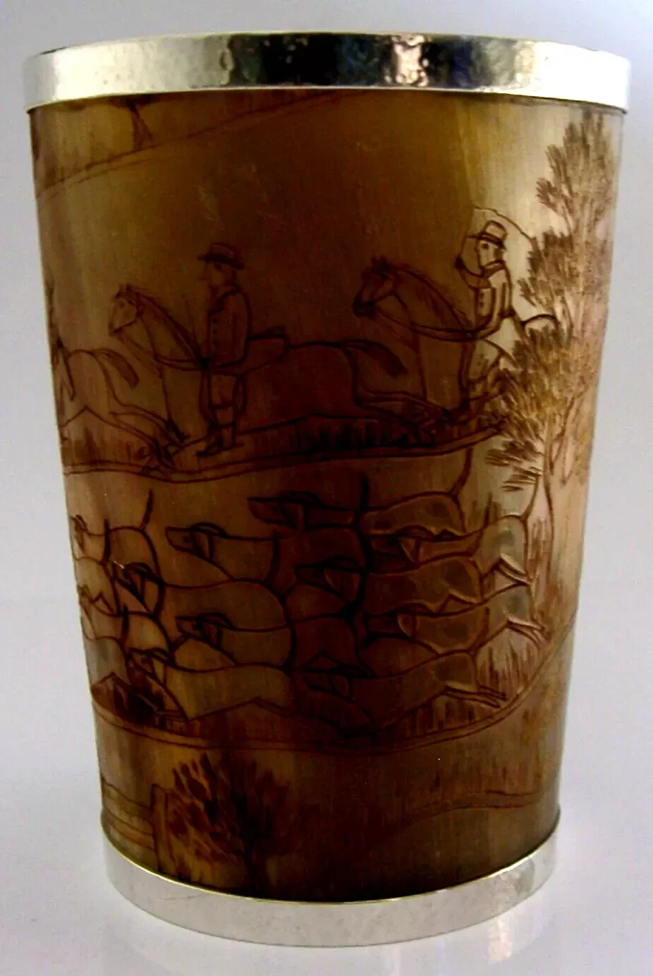 A superb large solid sterling silver rimmed hunting beaker. Its rims are silver, unmarked, but tested. I would date it to the mid to late 19th century by the style of dress. It has been engraved with a detailed stag hunting scene. It is in superb condition being free from dings splits holes chips cracks and repairs. It measures approx. 4.75 inches (12cm) tall by 3.5inches (8.5cms) across the rim and weighs 192 grams. A superbly made very high quality piece.