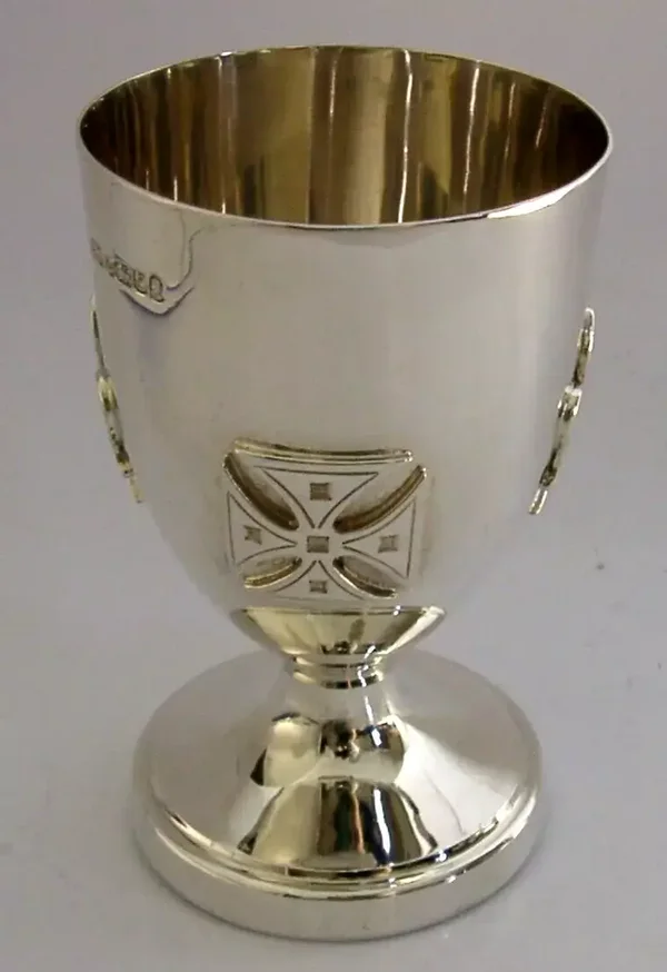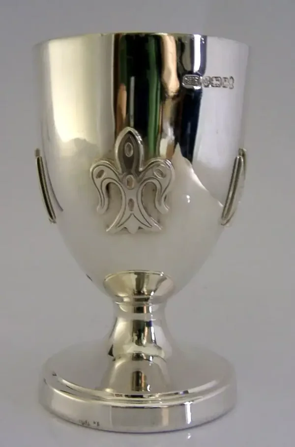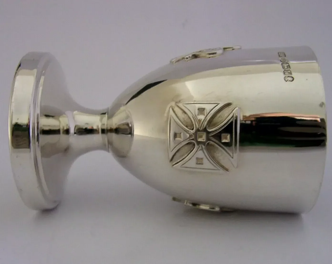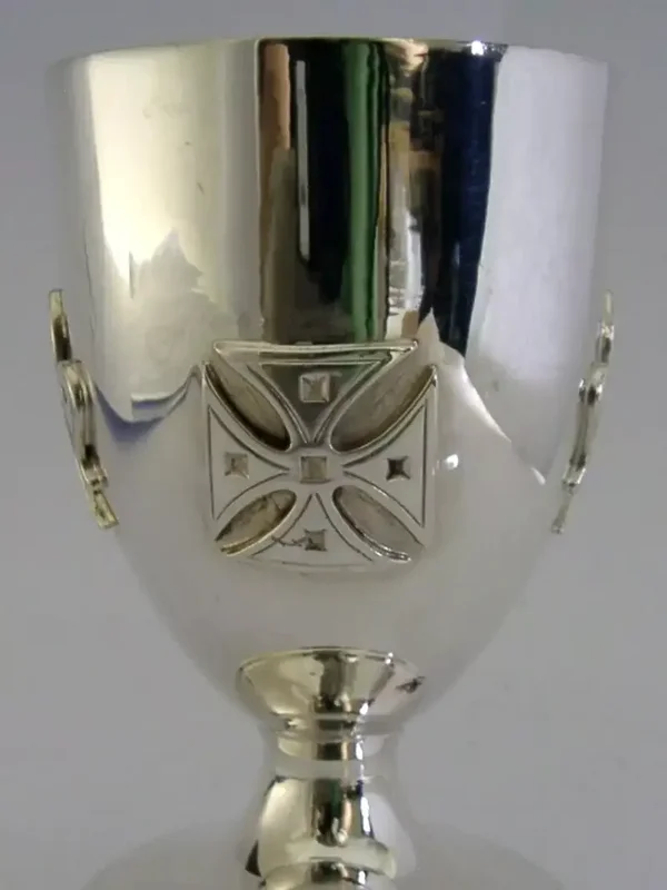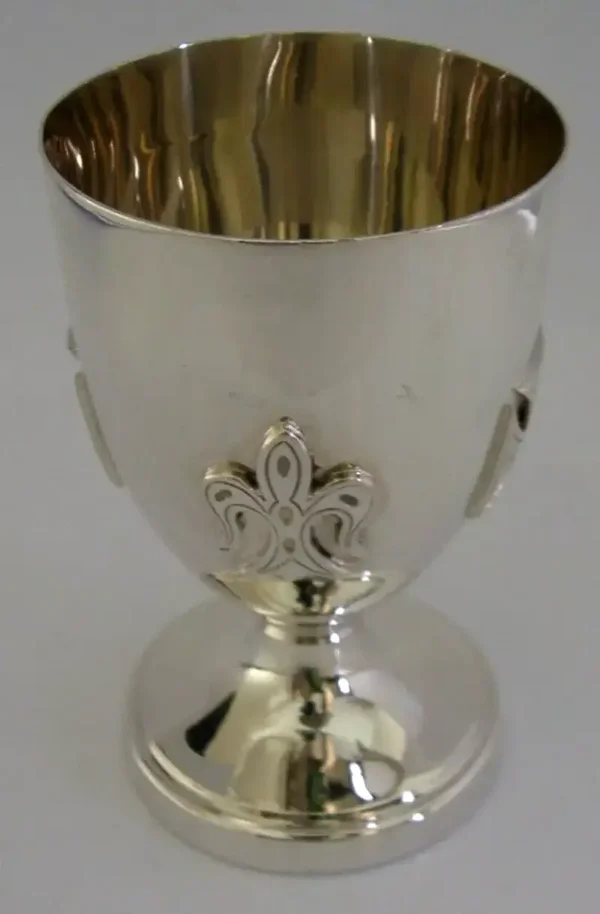 A beautiful English solid sterling silver chalice. It is hallmarked for Sheffield 1977 with the maker being EHP. It has been superbly designed being decorated with applied Knights Templar style crosses and fleur-de-lys. It is in superb condition being free from dings splits distortions and repairs, (it does rock on its base slightly). It measures approx. 4.5 inches (11.1cm) tall by almost 3 inches (7cm) across the rim and weighs 157 grams. A very good quality well made piece.