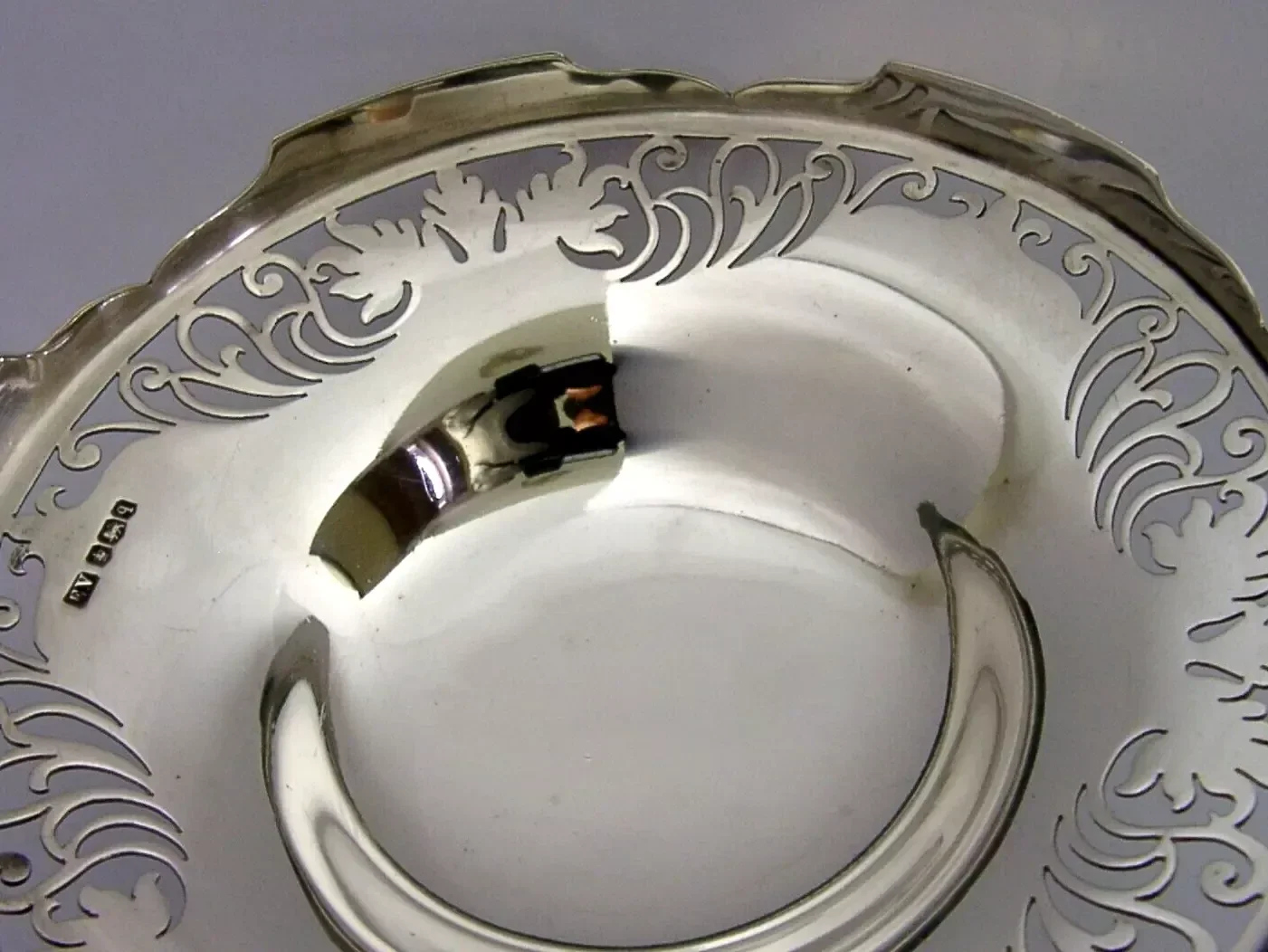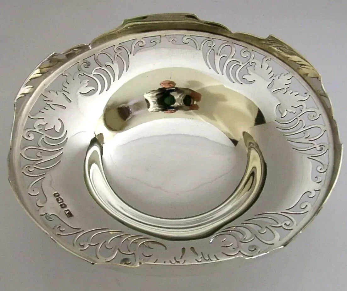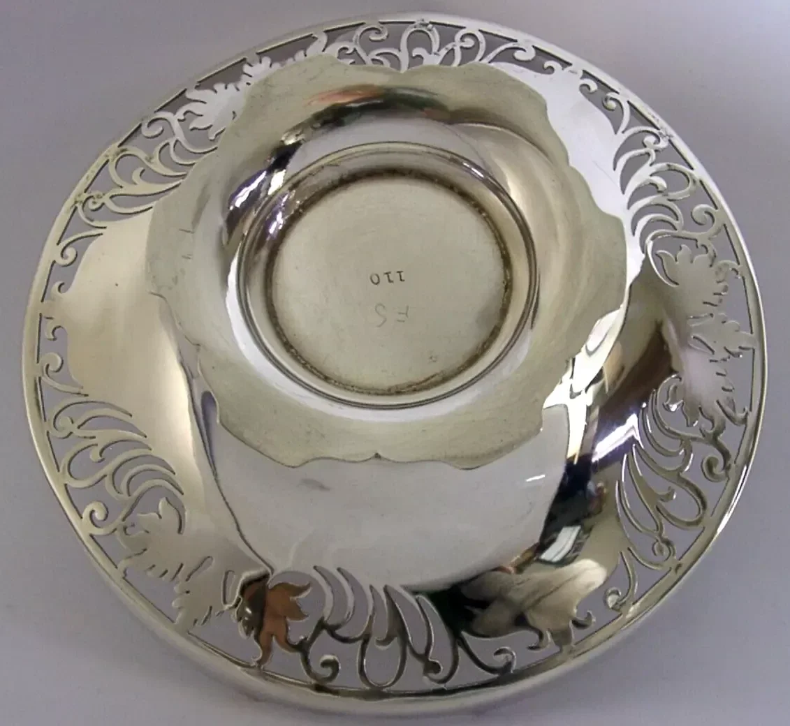 A beautiful English Art Deco solid sterling silver dish or bowl. It is hallmarked for Sheffield 1933 with the makers marks being EV. It has been superbly designed being pierced with scrolls and acanthus leaves and is in super condition being free from dings splits holes and repairs. It measures approx. 5.5 inches (14cm) across by 2 inches tall and weighs 164 grams. A very good quality pretty piece.